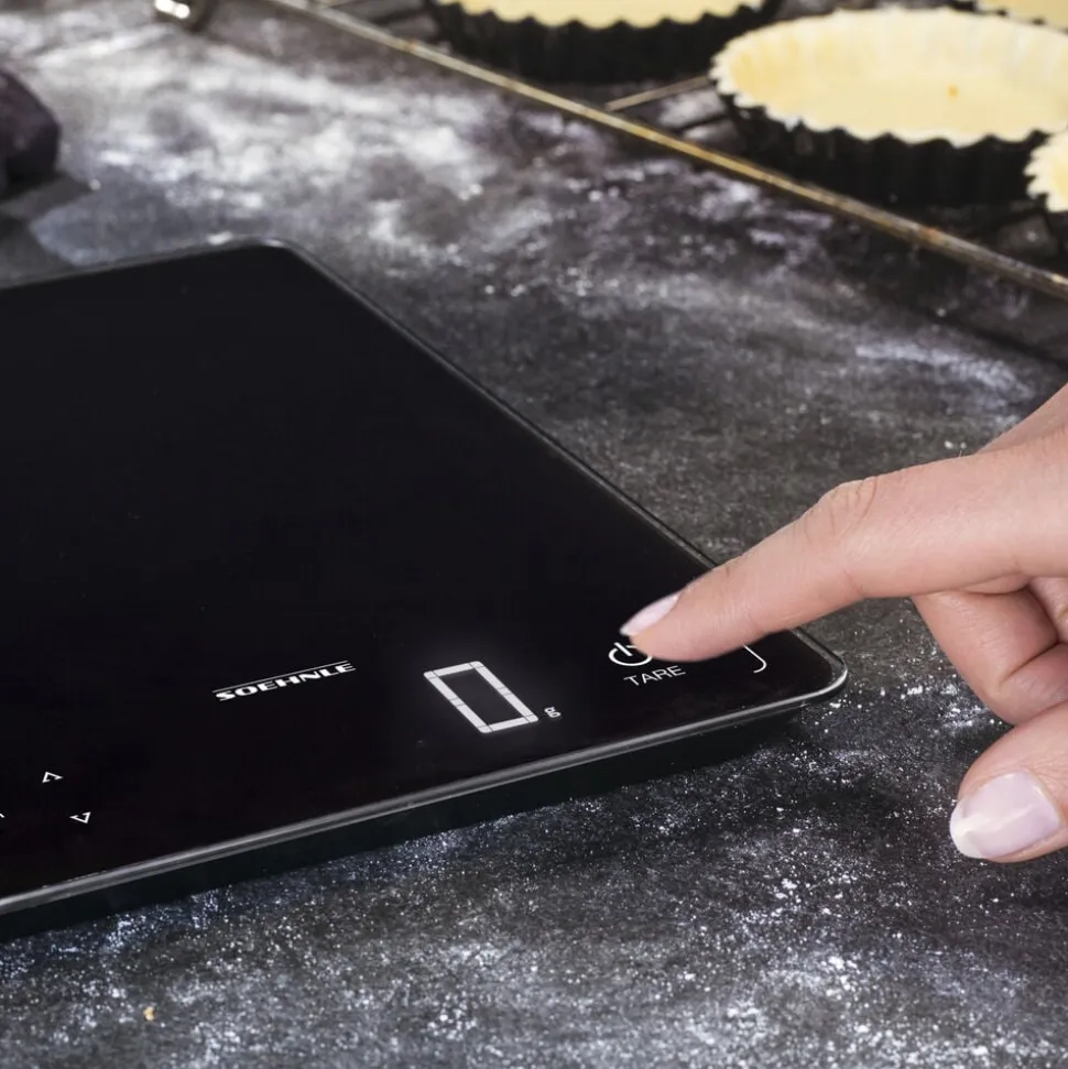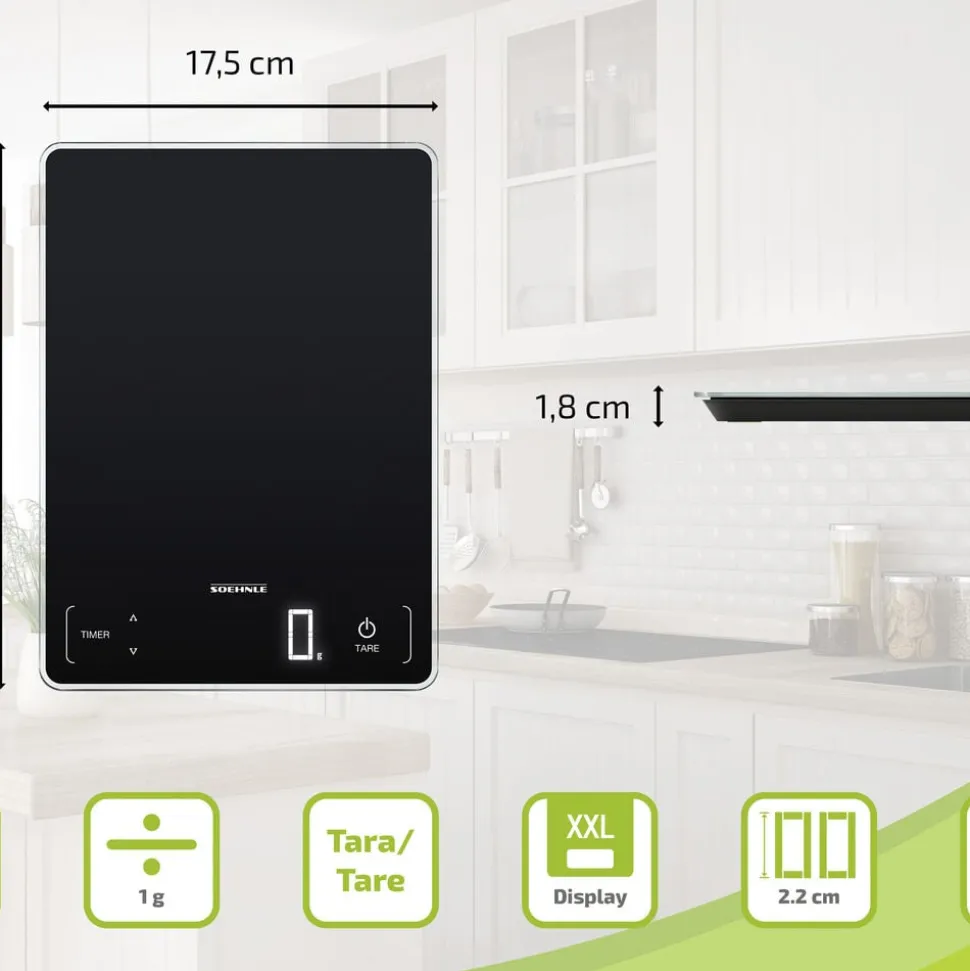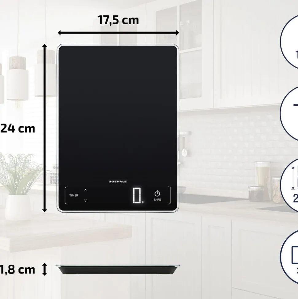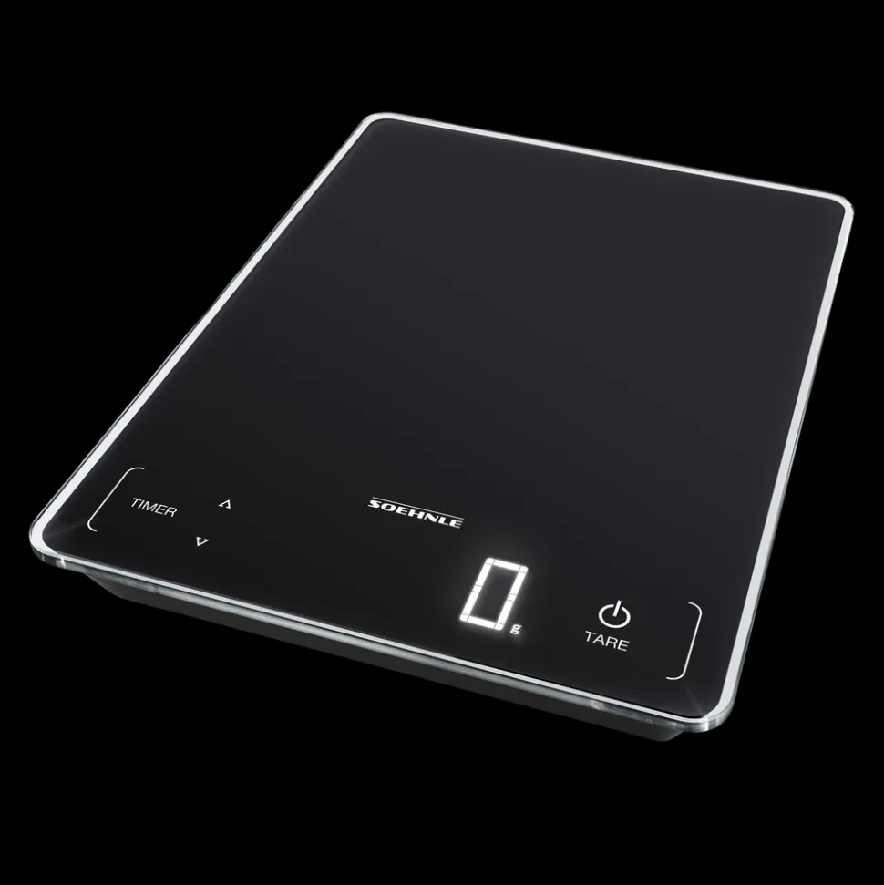 Page Profi 100 er en køkkenvægt i kompakt og ekstra tyndt design (24 x 17,5 x 1,8 cm). Vejer op til 15 kg med interval på 1 g, hvilket gør den ideel til fx krydderier. Letlæseligt display, tarafunktion og automatisk sluk. Enhederne vises i g/kg eller oz/lb. Køkkenvægten har en overflade af praktisk sikkerhedsglas, der er hurtigt og nemt at gøre rent.