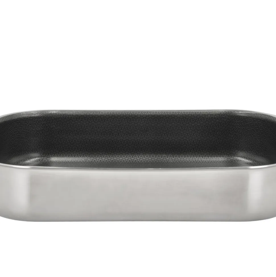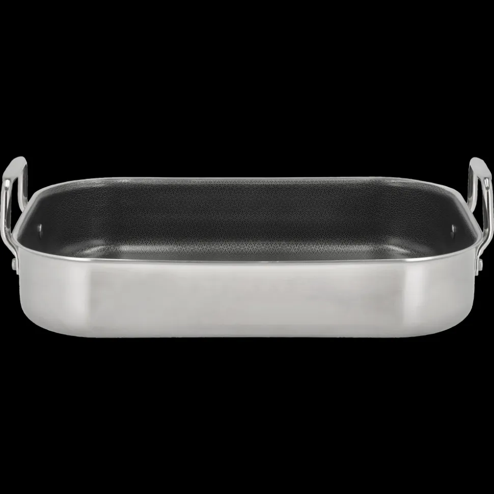 Bradepande, 35 x 25 x 7 cm. De udvendige mål er 39 x 26,5 x 10,6 cm og angiver, hvor meget bradepanden fylder inkl. håndtag. Paillon Hybrid-serien fra Pillivuyt Gourmet er fremstillet i 3-ply rustfrit stål, som er en konstruktion af to lag rustfrit stål med et aluminiumlag imellem. Det betyder, at varmen fordeles hurtigt og fastholdes jævnt. Vær forsigtig ved opvarmning – varm gryder og pander langsomt op og undgå at overophede. Takket være den indvendige keramiske hybridbelægning får du en slidstærk overflade med en effektiv non-stick-effekt. Det forhøjede mønster i rustfrit stål beskytter bunden, mens den keramiske topbelægning sikrer, at maden ikke brænder fast.