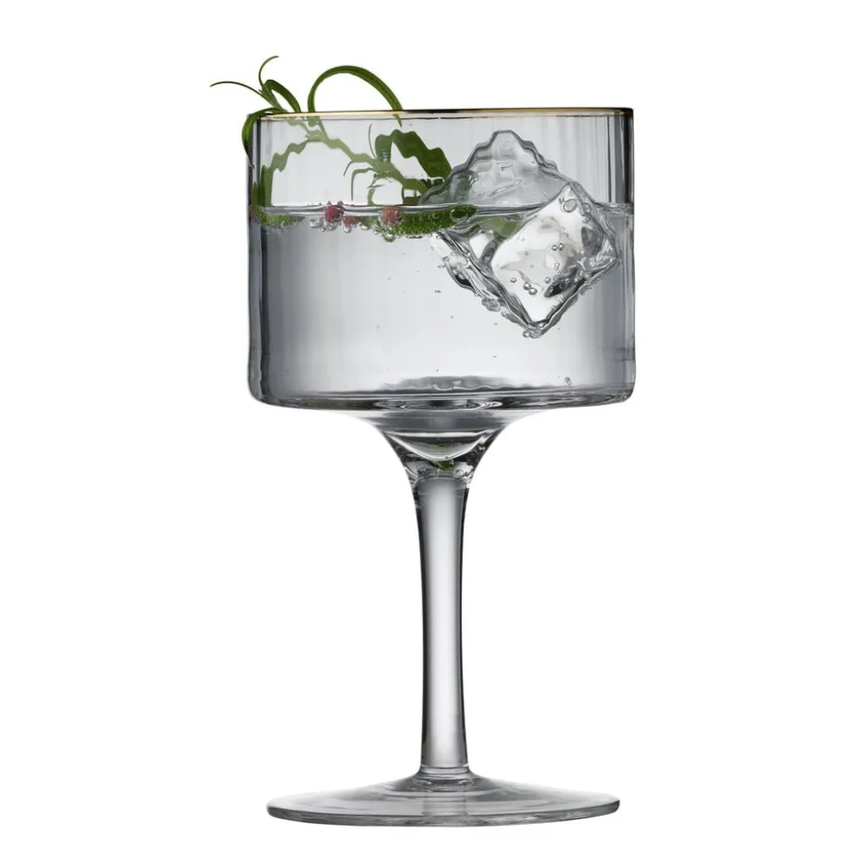 Smukt gin & tonic-glas. Det elegante, riflede design med en fin guldkant giver glasset et flot vintagelook, der samtidig afspejler tidens trends. Server en G&T i glasset og lad de fine facetter reflektere lyset og glassets indhold på smukkeste vis.