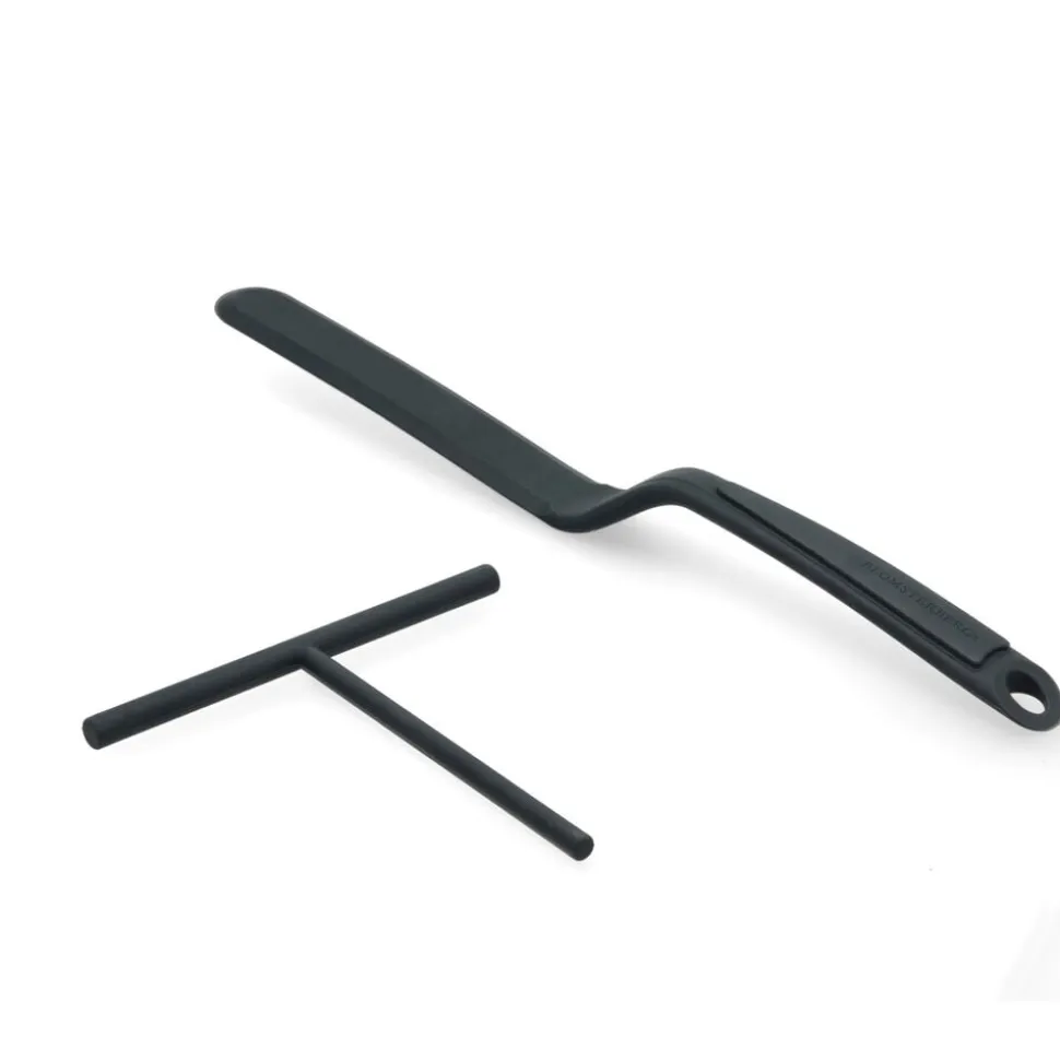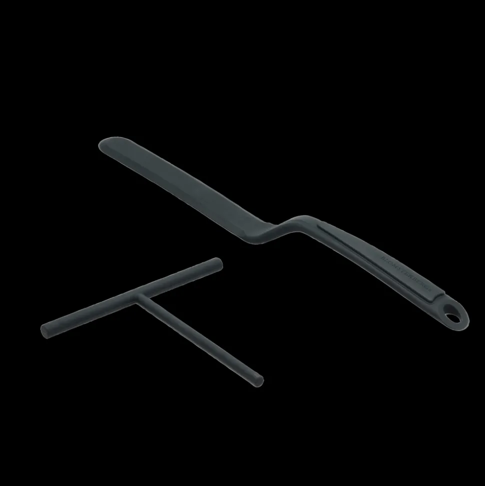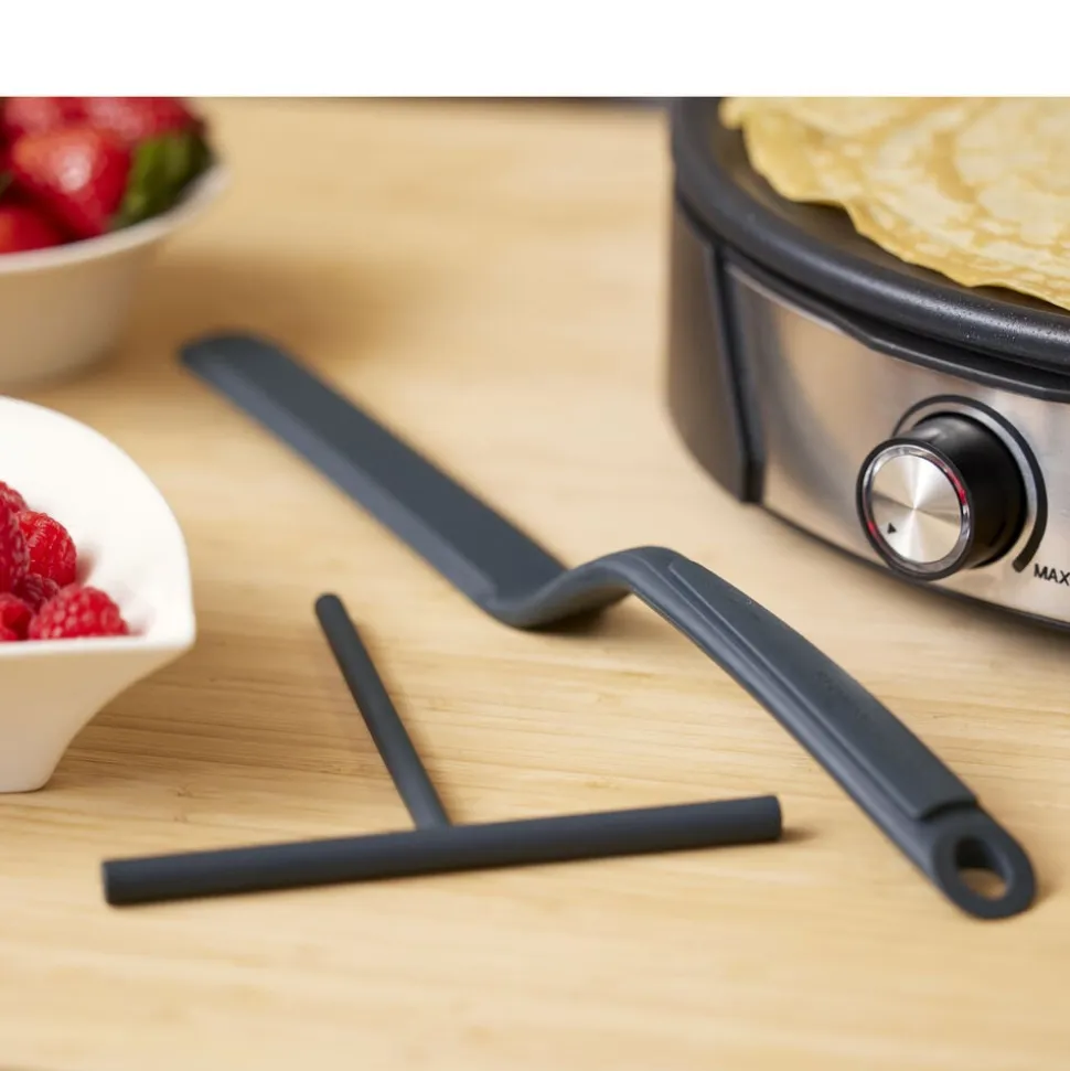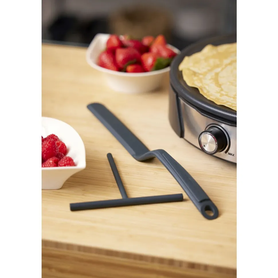 Forkæl familien med lækre, nybagte pandekager – søde eller salte, tynde og sprøde eller tykke og svampede, som I nu bedst kan lide dem. Redskabssættet i grå silikone består af en 14 cm bred T-spatel, der gør det nemt at fordele pandekagedejen i et ensartet lag på panden, og en god, lang palet med praktisk knæk til at vende og servere pandekagerne med.
