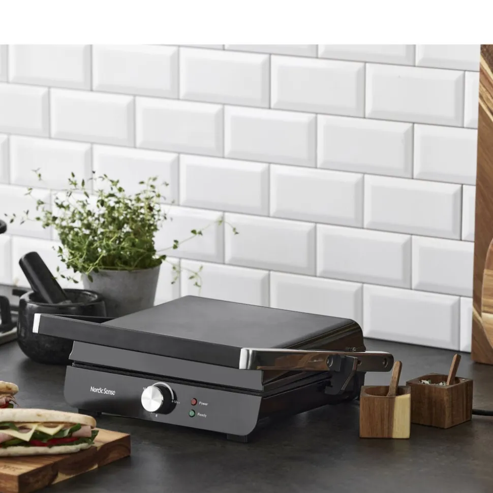 Paninigrill til alt fra sprøde sandwiches til saftige bøffer. De keramiske non-stick-grillplader på 28 x 23 cm sikrer, at maden ikke brænder fast, og grillen kan åbnes helt op til 180° for dobbelt grillareal. Indikatorlys viser, når grillen er klar, og temperaturen kan justeres nemt efter behov. Drypbakken opsamler fedt og madrester, mens låsefunktionen sørger for nem opbevaring, når grillen ikke er i brug.