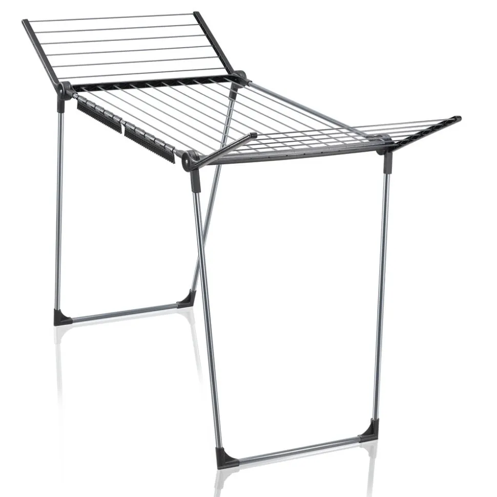 Pegasus 180 Solid Black er et robust tørrestativ med masser af plads til dit vasketøj. De stabile, parallelle ben gør, at det står sikkert både inde og ude, og med 18 meter tørreplads kan du hænge næsten to maskinvaske op ad gangen. De foldbare sidevinger har en vingehøjde på 105 cm høje, så længere tekstiler som bukser og håndklæder kan hænge uden at røre gulvet. Som en ekstra smart detalje følger der to smarte holdere med, så du nemt kan hænge små dele som strømper og undertøj op – helt uden klemmer. Når tørrestativet ikke er i brug, kan det let klappes sammen og opbevares pladsbesparende. De sorte og antracitgrå tørrestænger har en slidstærk pulverlakering, der gør dem rustfri og ekstra holdbare.