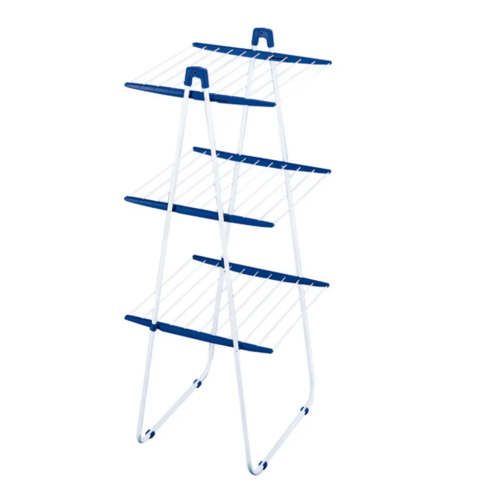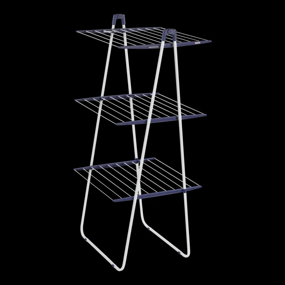 Stort tørrestativ, som kun tager lidt plads, men har 19 meter tørreplads til hele to maskinfulde tøj ad gangen. Midterste niveau kan foldes sammen, så det er nemt at tørre fx lange bukser og kjoler. Stativet har to sokkeholdere og foldes nemt sammen.