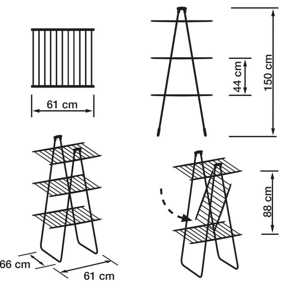 Dette høje tørrestativ er oplagt at bruge i brusenichen eller andre steder, hvor pladsen er trang. Selv om det næsten ingenting fylder i gulvareal, har det med sin højde på 150 cm plads til at tørre meget tøj ad gangen. Der er to smarte sokkeholdere, og midterniveauet kan foldes til side og give plads til at tørre lange stykker tøj.