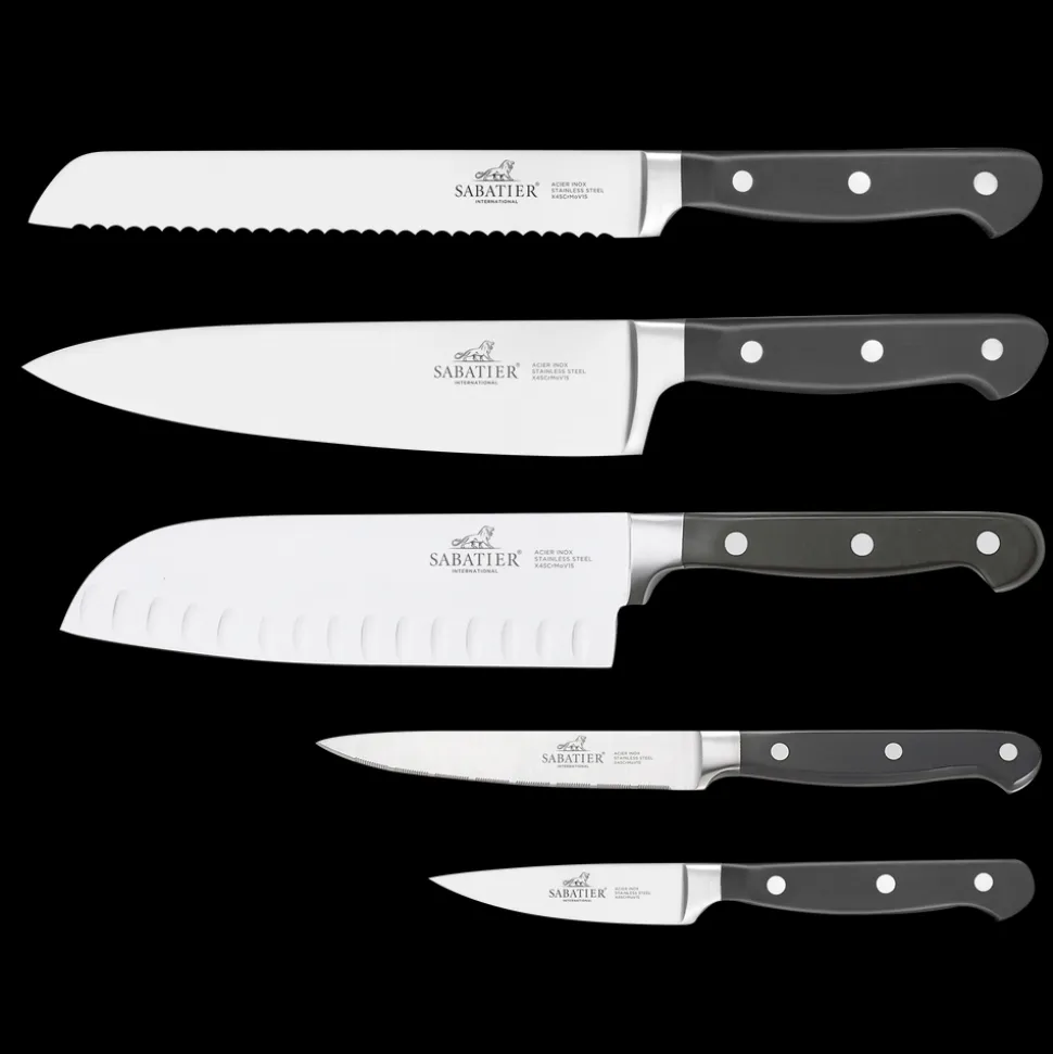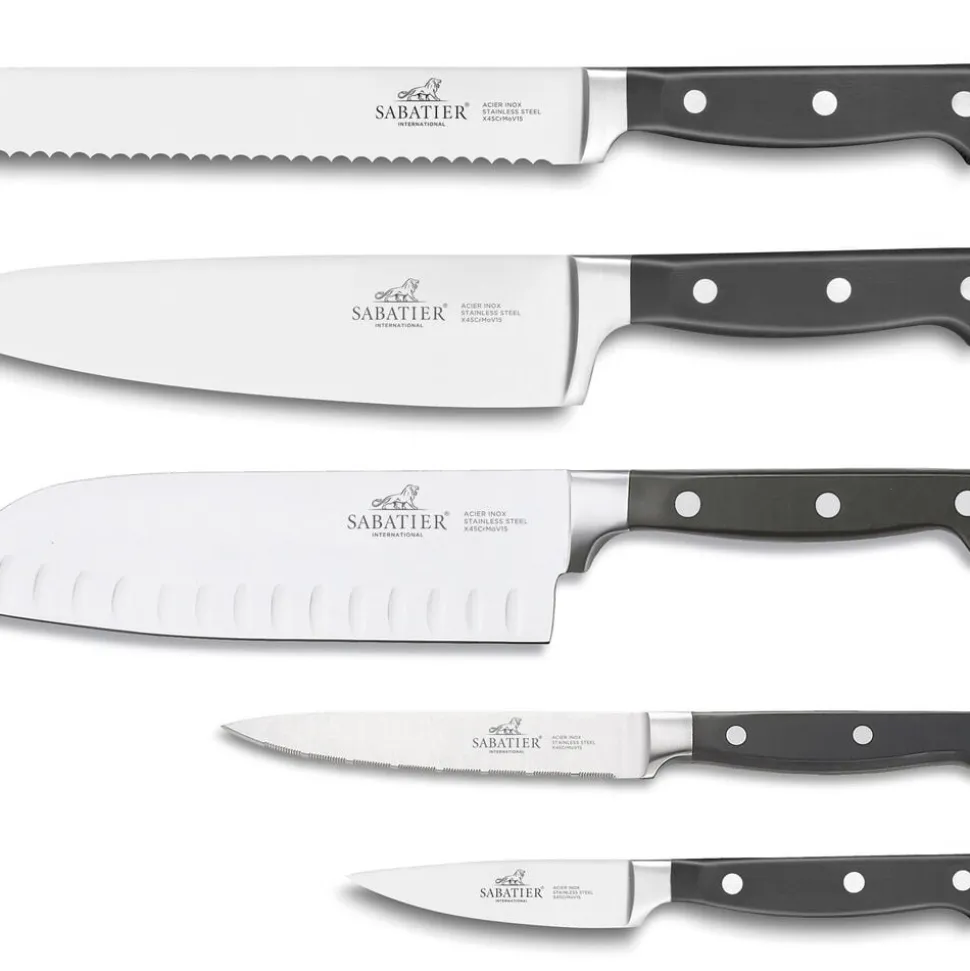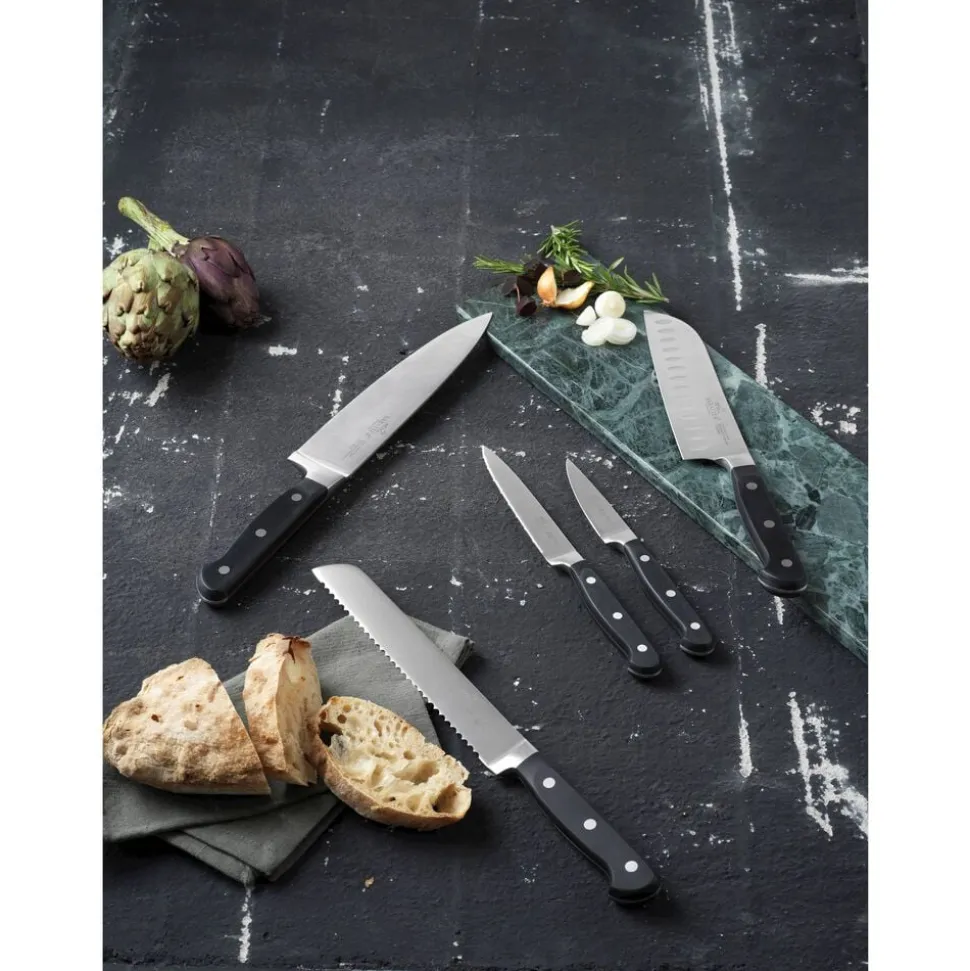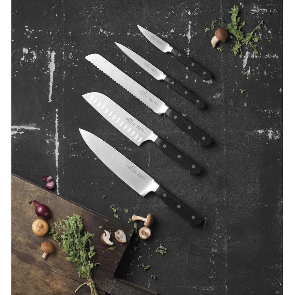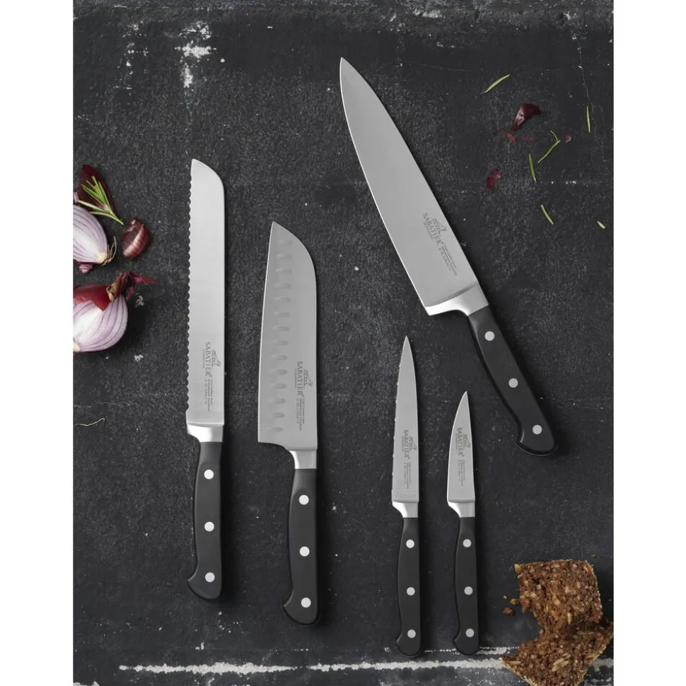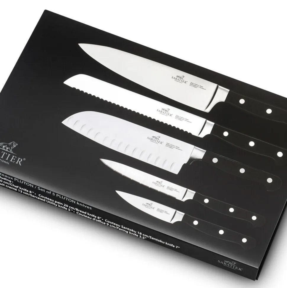 Pluton knivsæt fra Lion Sabatier til alle dine opgaver i køkkenet. Knivene har en optimal vægt og balance, der ligger behageligt i hånden. Knivsættet kommer i en gaveæske og består af kokkekniv (20 cm), brødkniv (20 cm), santokukniv (18 cm), tomatkniv (13 cm) og urtekniv (9 cm).