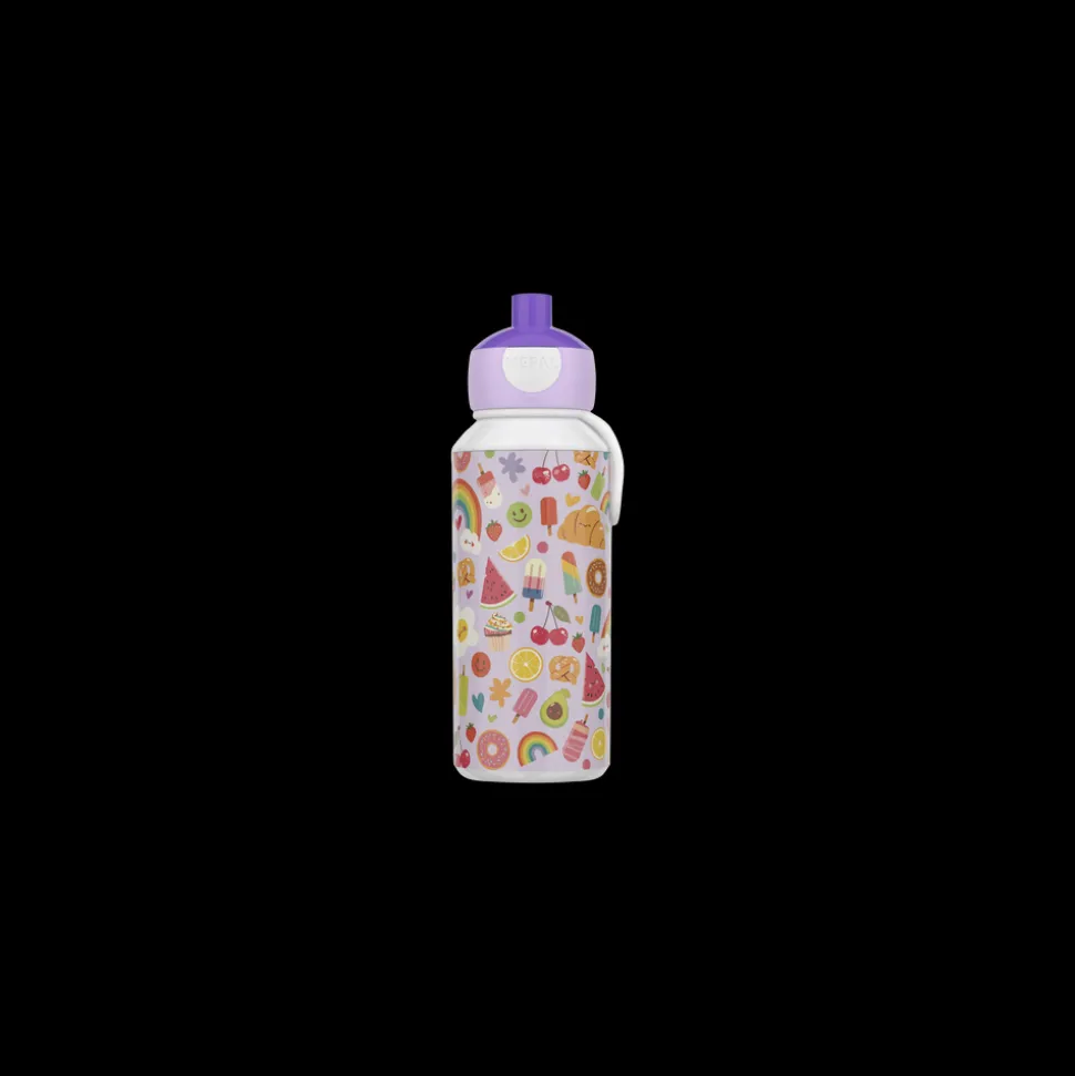 Mepal drikkeflaske med Food doodle-motiv. Den kendte, robuste drikkeflaske rummer 400 ml, har praktisk silikonestrop og et smart pop-up system med mundstykke, der nemt udløses ved tryk på en knap og samtidig er let at skille ad og rengøre.