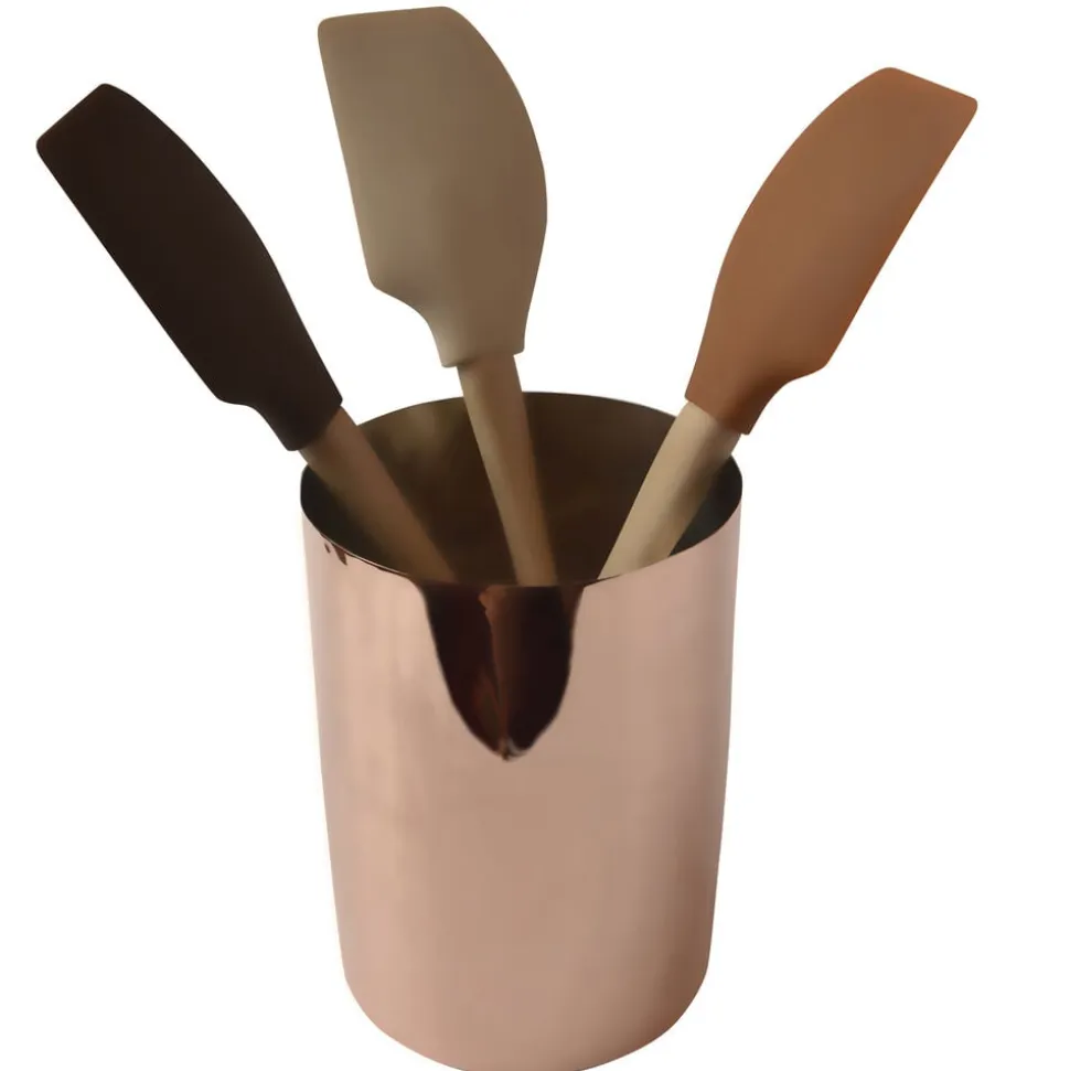 Redskabskrukke af børstet kobber i elegant fransk design. Opbevar dine grydeskeer, piskeris og dejskrabere med stil. Redskabskrukken fra Mauviel giver dig både praktisk opbevaring og et smukt designelement i køkkenet.
