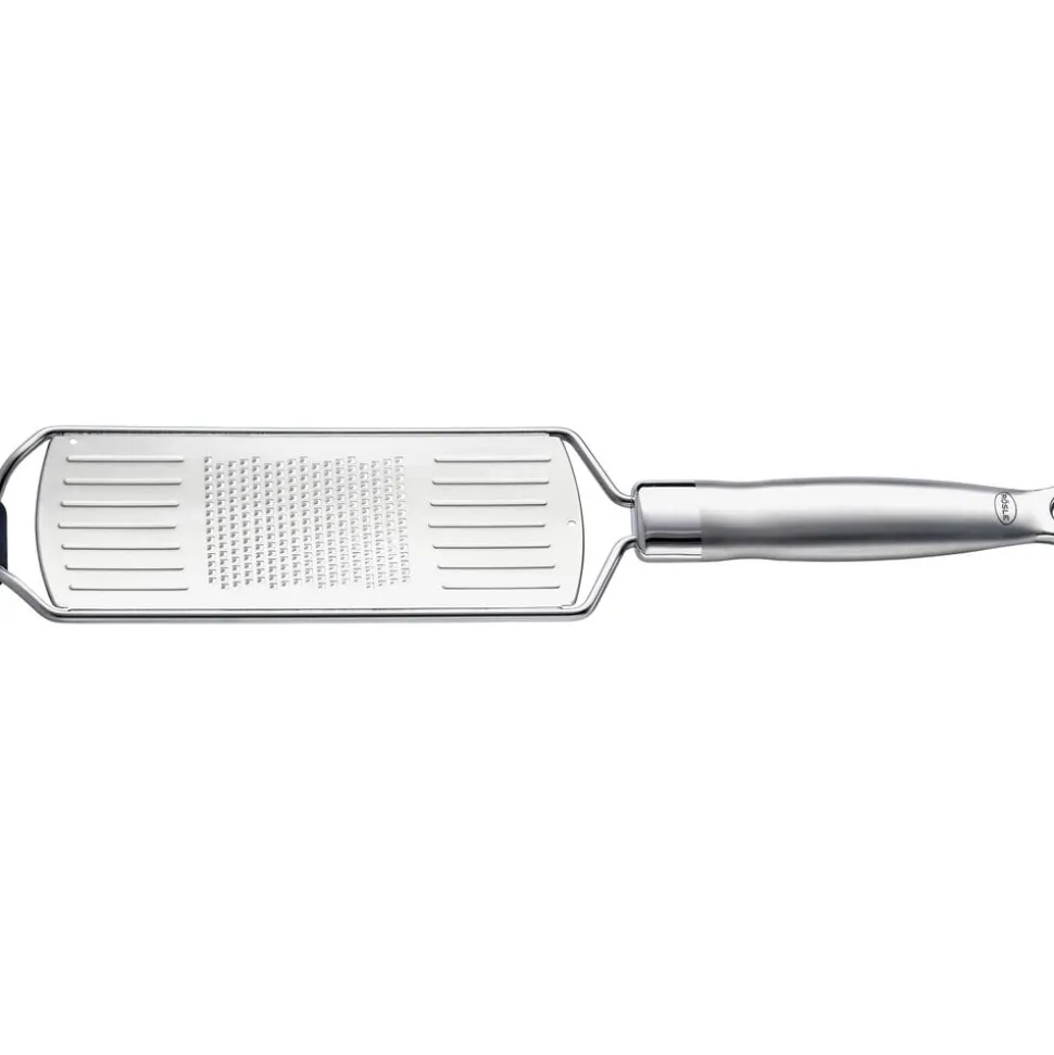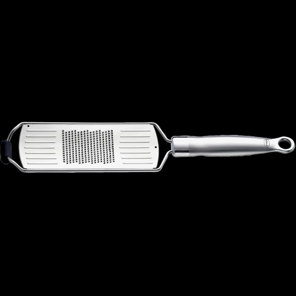RÖSLE fint rivejern med håndtag lavet udelukkende af rustfrit stål. Det ergonomisk formede håndtag føles sikkert i hånden og har en praktisk krog til ophængning som perfekt afslutning. Ideelt til hård ost, fx parmesan til fuldendt pasta, til krydderier, chokolade eller ingefær, når du skal bage. Rivejernets specielt formede tænder sørger for hurtig rivning med en minimal indsats.
