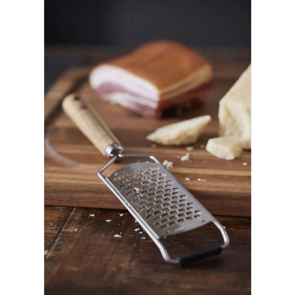 Groft rivejern med stor riveflade i rustfrit stål og skaft af akacietræ. Velegnet til ost, chokolade, løg og lignende. Rivejernet har en trekantet silikoneforstærkning i bunden, så det står bedre fast, når du støtter det mod underlaget ved brug, samt beskyttende skærebladsværn for sikker opbevaring.