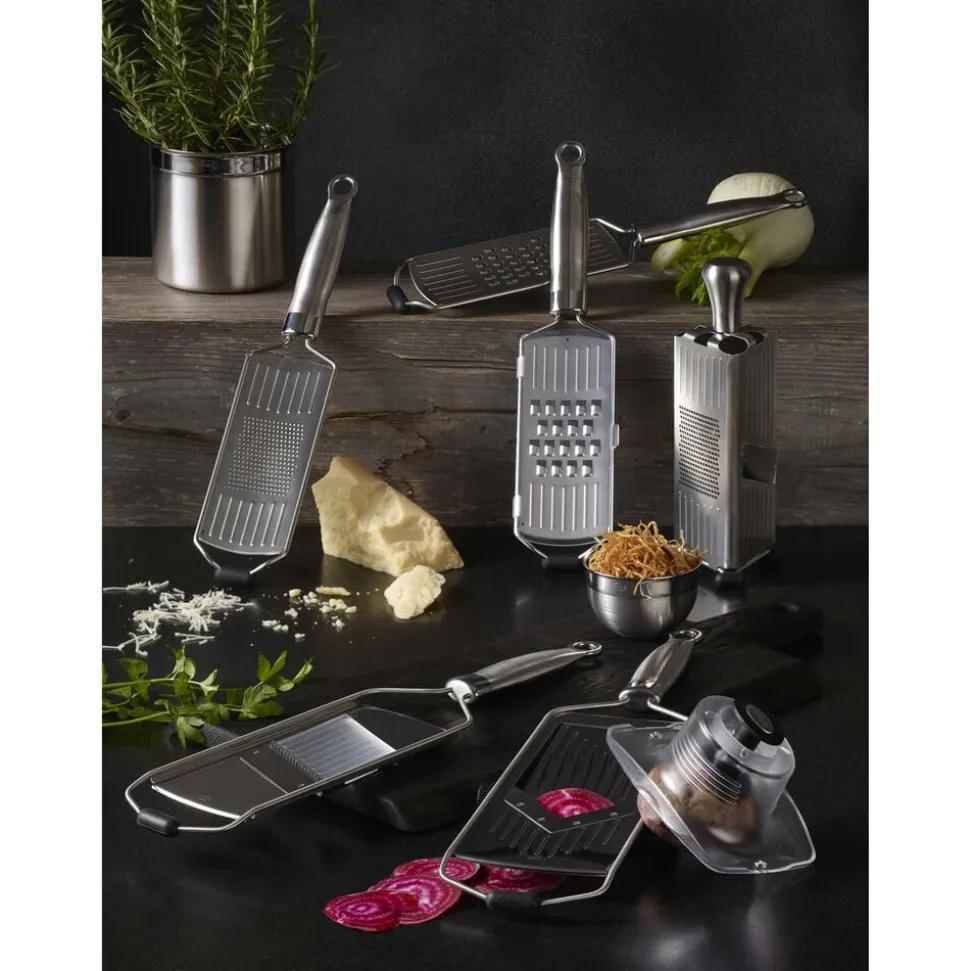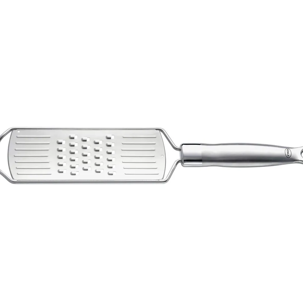 RÖSLE medium rivejern med håndtag lavet udelukkende af rustfrit stål. Det ergonomisk formede håndtag føles sikkert i hånden og har en praktisk krog til ophængning som perfekt afslutning. Ideelt til rivning af hårdere grøntsagstyper som agurker, gulerødder, rødbeder og kålrabi. Også ideelt til chokolade og ost. Rivejernets specielt formede tænder sørger for hurtig rivning med minimal indsats.