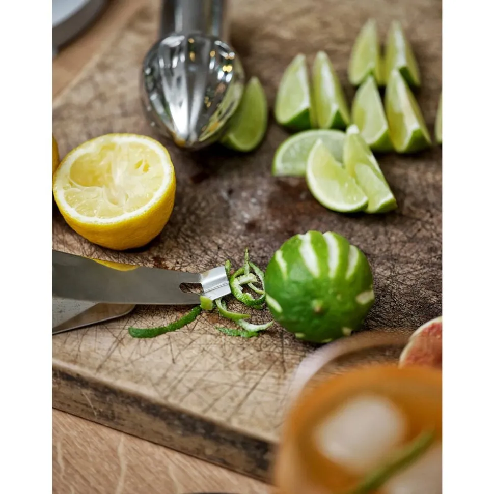 Giv selv den enkleste drink, dessert, kage eller salat et stilfuldt løft. Det elegante cannelerjern skærer lidt bredere strimler af frisk agurk, appelsin eller andre frugter og grøntsager. Designet er inspireret af skrællens kurve, når den slipper frugten.