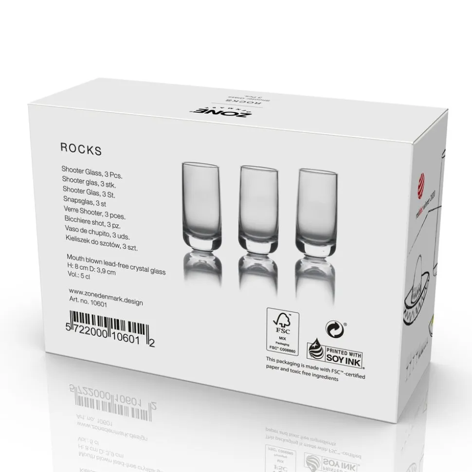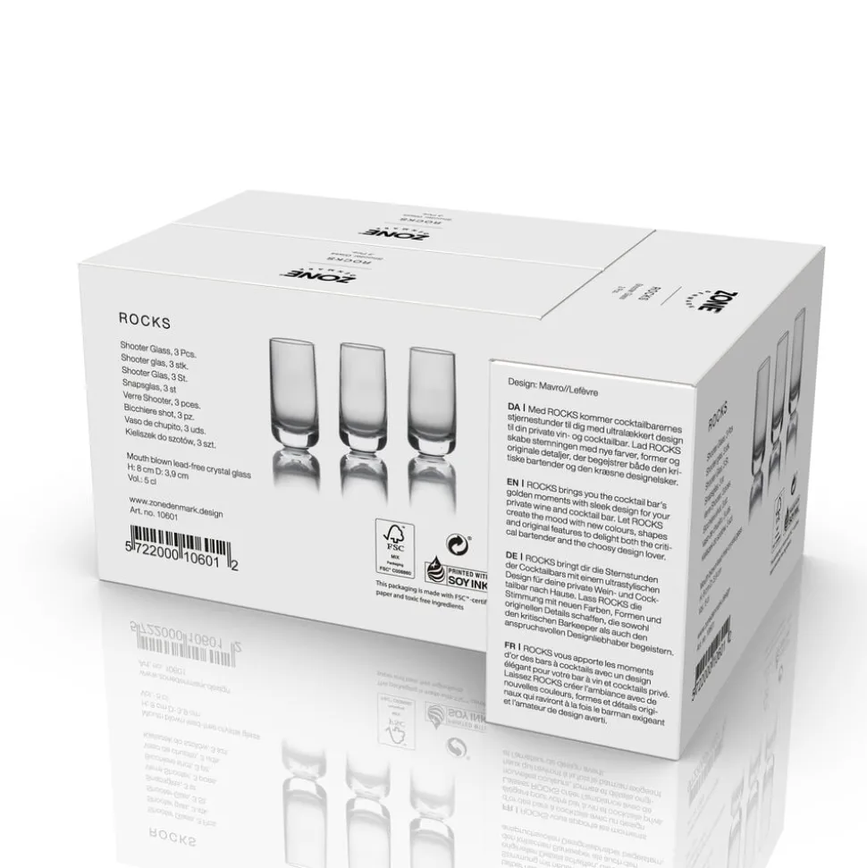 Denne serie med en række forskellige glas af blyfrit mundblæst krystal er en del af Zone Denmarks barkoncept Rocks. Designet er en helt enkel konisk form med lækre, sanselige detaljer som fx massiv bund – skabt til at få det bedste frem i dine drinks og sjusser.