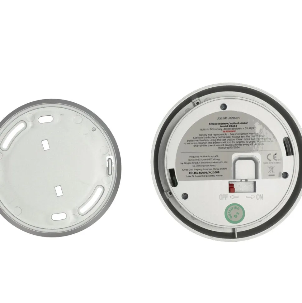 Jacob Jensens optiske røgalarm er skabt til at skabe tryghed, så den samtidig tilføjer et strejf af elegance til dit hjem i form af det innovative design. En konstant pulserende lysstråle detekterer røg. Hvis lysstrålen brydes af røgpartikler, vil alarmen lyde. Integreret batteri med en levetid på 10 år. Denne røgalarm er en uafhængig enhed og kan ikke serieforbindes.