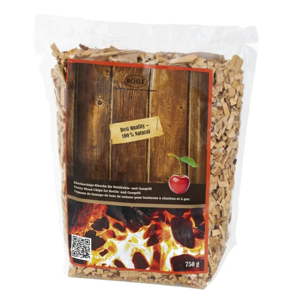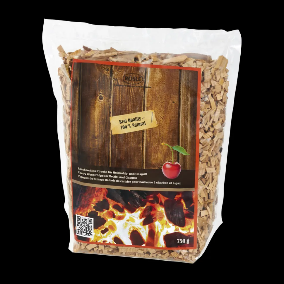 Røgflis af 100 % naturligt, ubehandlet træ. Kirsebæraroma ideel til fjerkræ, oksekød, svinekød og grøntsager. Giver en mild sød-frugtagtig røgsmag. Fås også i andre 3 varianter: æble, bøg og Hickory. Meget røgintensiv, og derfor anbefales korte rygetider. Ingen kemikalier tilsat, ingen bark. Tilføjer en aromatisk røgsmag svarende til amerikansk grillsmag.