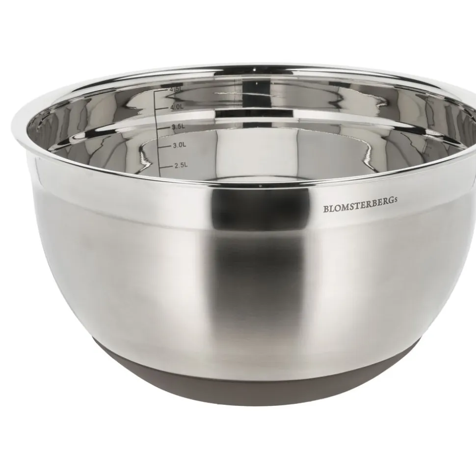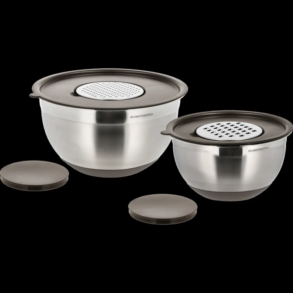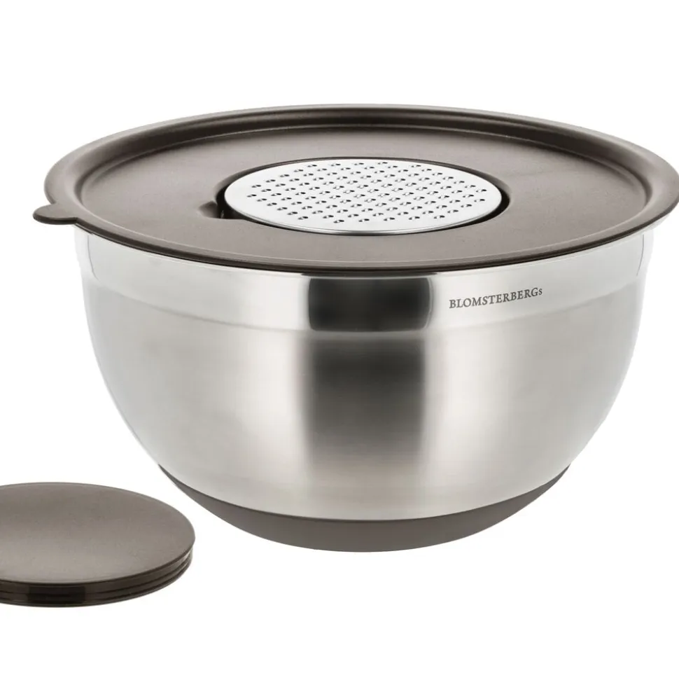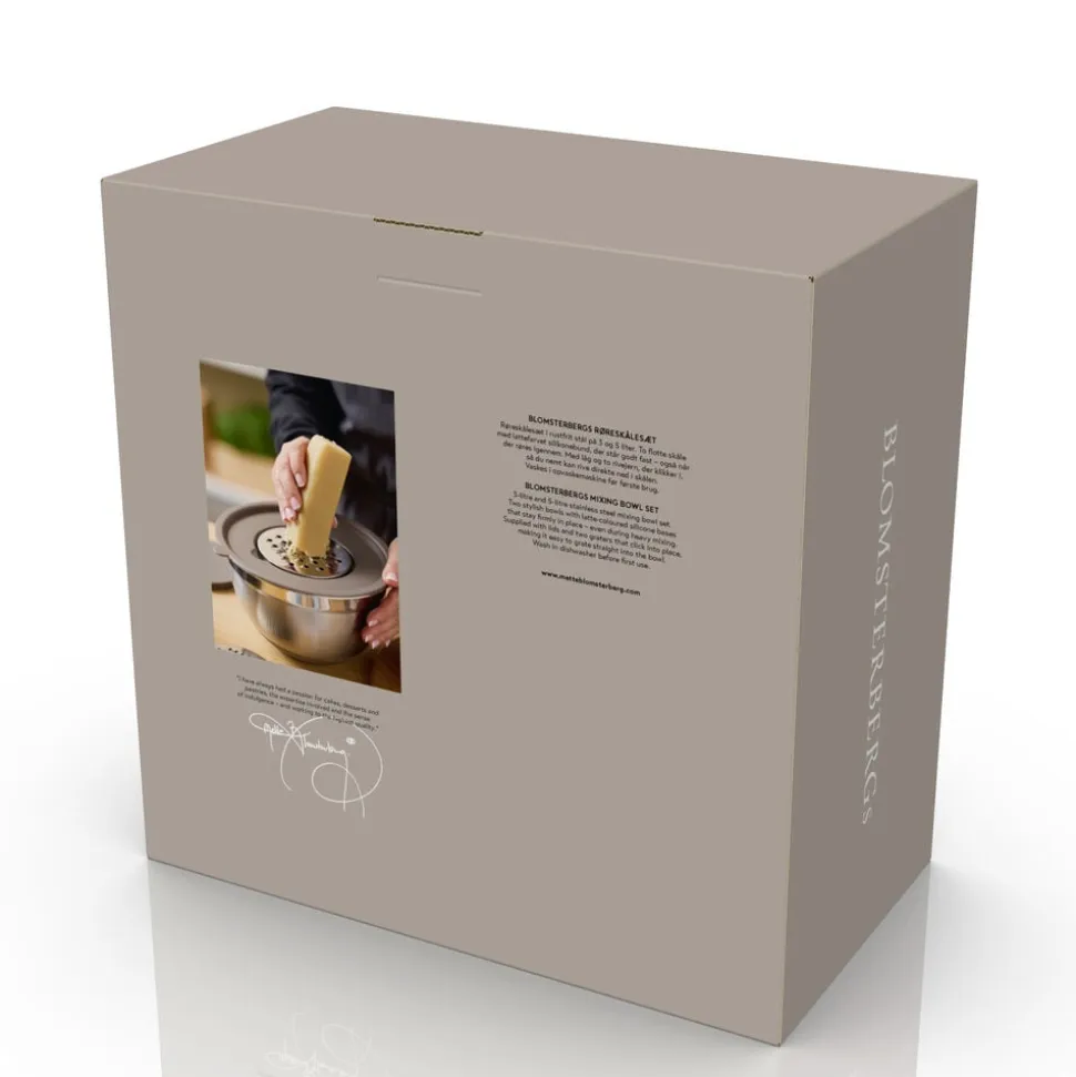 Røreskålesæt i rustfrit stål på 3 og 5 liter. Sættet har ikke bare et lækkert design, men også smarte detaljer. Skålene står solidt på bordet takket være en skridsikker, lattefarvet silikonebund, der både gør dem stabile og pæne at se på. Der medfølger også låg samt to forskellige rivejern, der nemt klikkes fast i låget. En smart løsning, når der skal rives grøntsager eller andet godt direkte ned i skålen.