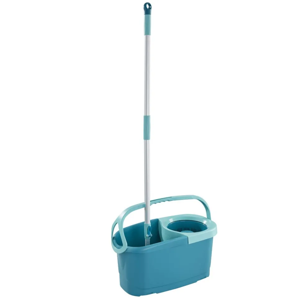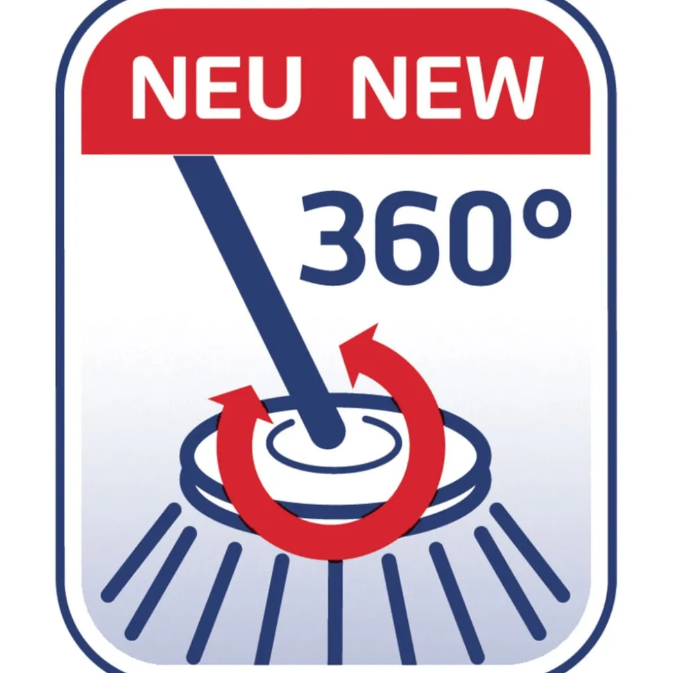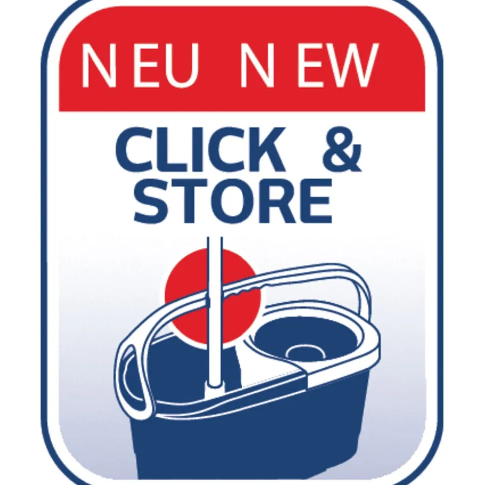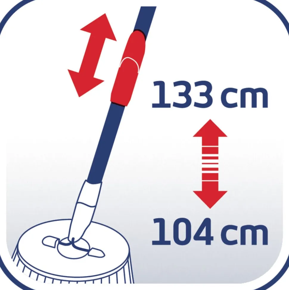 Teleskophåndtag med 360° kugleleje gør det muligt at føre moppen rundt i bølgede linjer og gøre rent under møbler. Under rengøring kan håndtaget sættes fast på den integrerede holder, så det ikke vælter, når spanden transporteres rundt. Spanden er desuden nem at tømme via den brede hældeende.