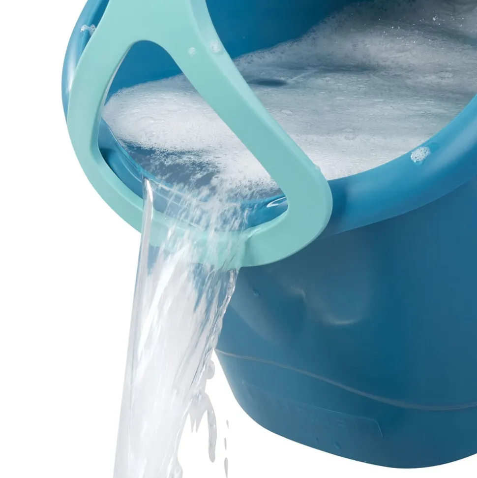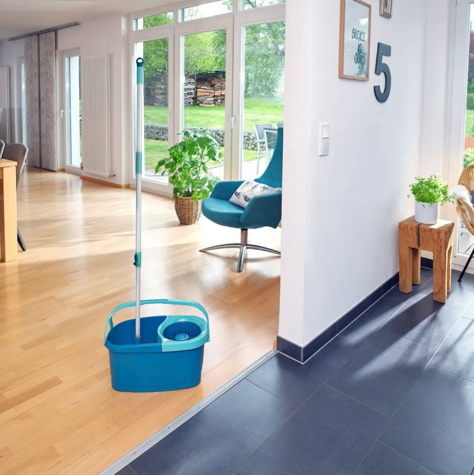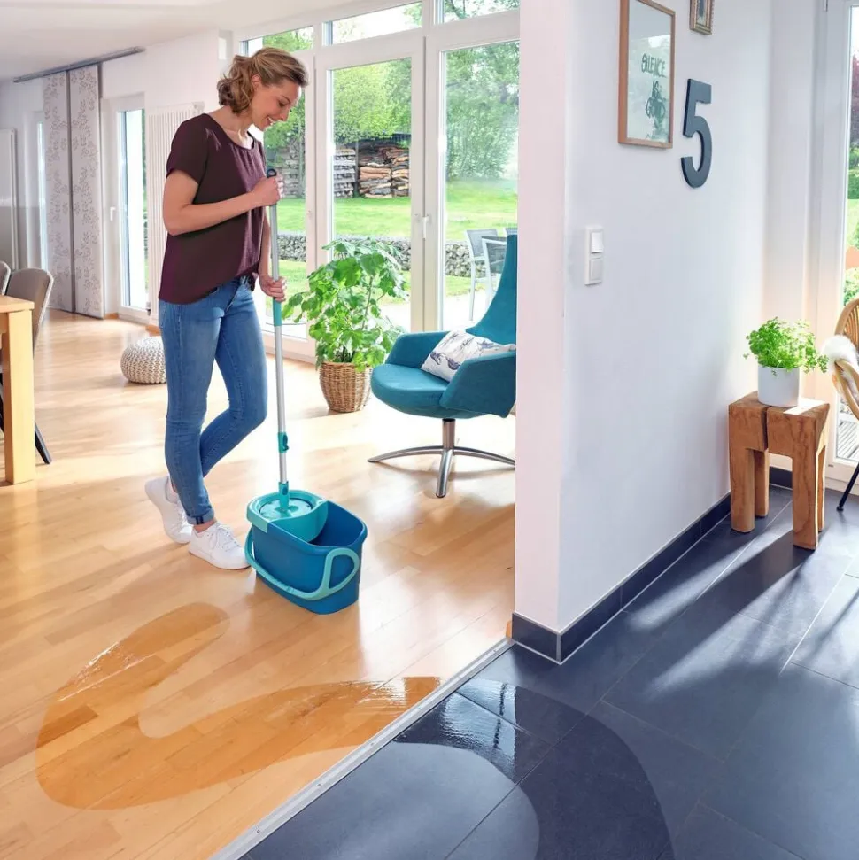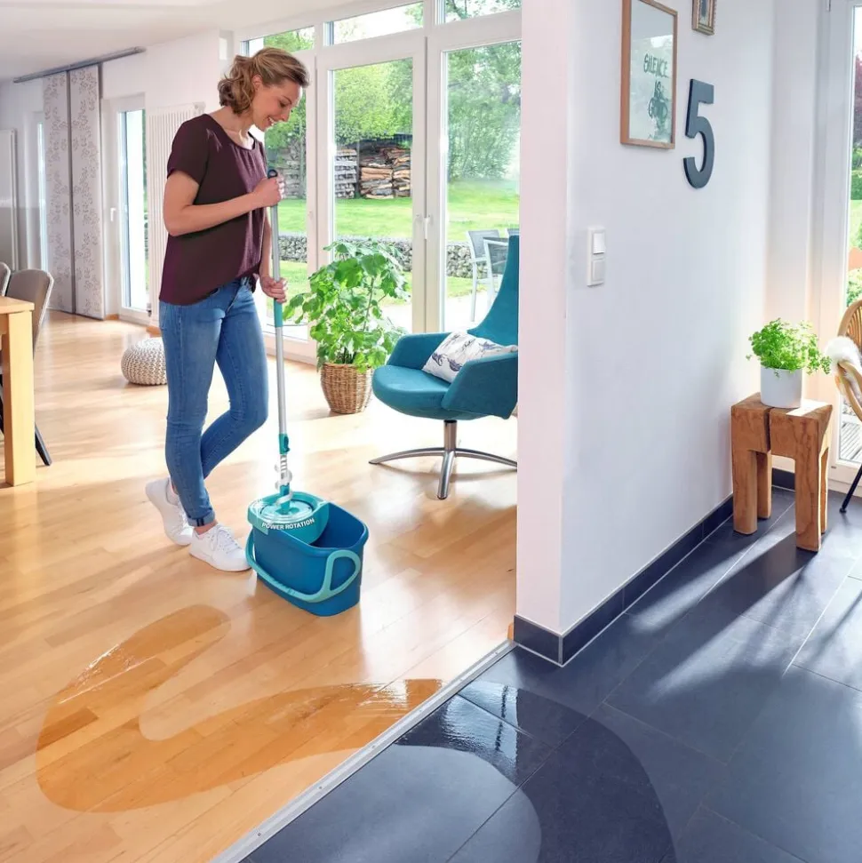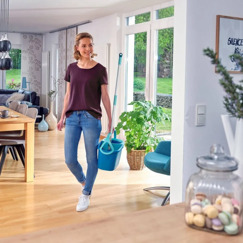 Teleskophåndtag med 360° kugleleje gør det muligt at føre moppen rundt i bølgede linjer og gøre rent under møbler. Under rengøring kan håndtaget sættes fast på den integrerede holder, så det ikke vælter, når spanden transporteres rundt. Spanden er desuden nem at tømme via den brede hældeende.