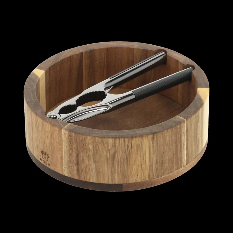 Nøddeknækkersæt med rund skål af akacietræ, dia. 17 cm, og nøddeknækker i metal med sort greb. Nøddeknækkerens hoved og håndtag passer ned i de små fordybninger på skålens kant, så den altid kan ligge klar til at knække nødder. Læg aldrig akacietræ i blød. Vaskes med varmt vand og mild sæbe. Tåler ikke opvaskemaskine. Kan med fordel efterbehandles med madolie et par gange om året.