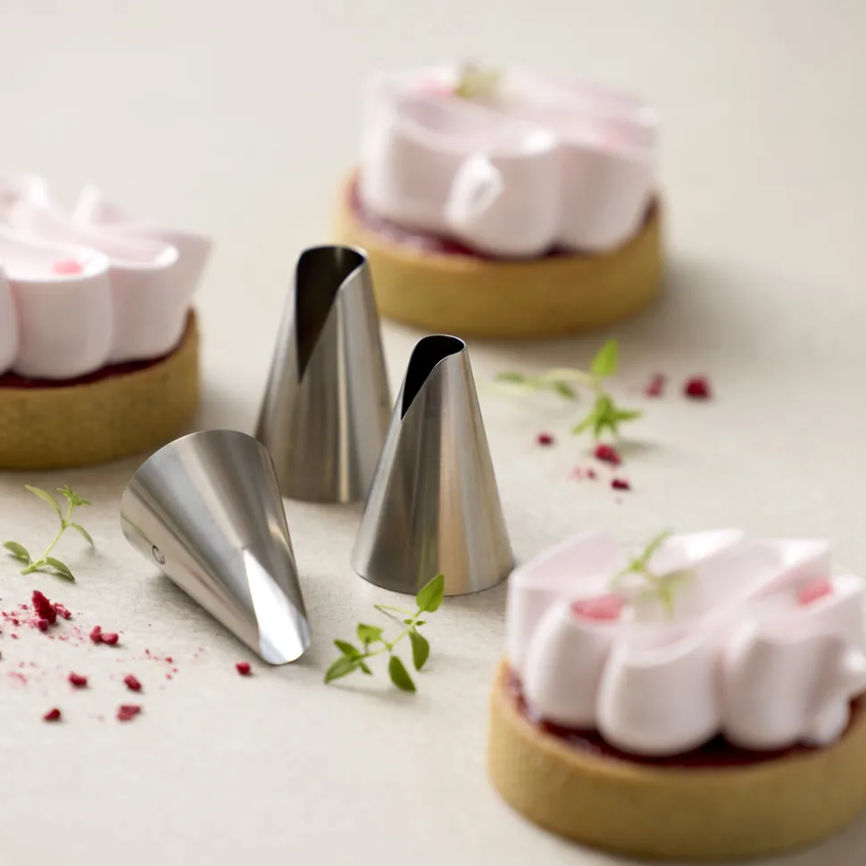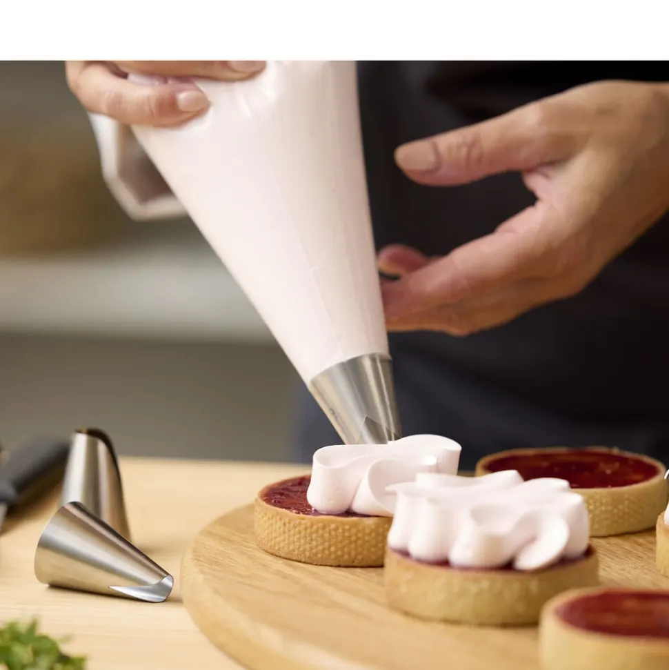 Tyllesættet indeholder tre tyller, der gør det muligt at lave de fineste dekorationer på dit bagværk. Uanset om du arbejder med marengs, smørcreme, piskede cremer, blød kransekagemasse eller småkagedej, er tyllesættet perfekt til at skabe dekorative mesterværker, der vil imponere enhver. Vaskes i opvaskemaskine før første brug.