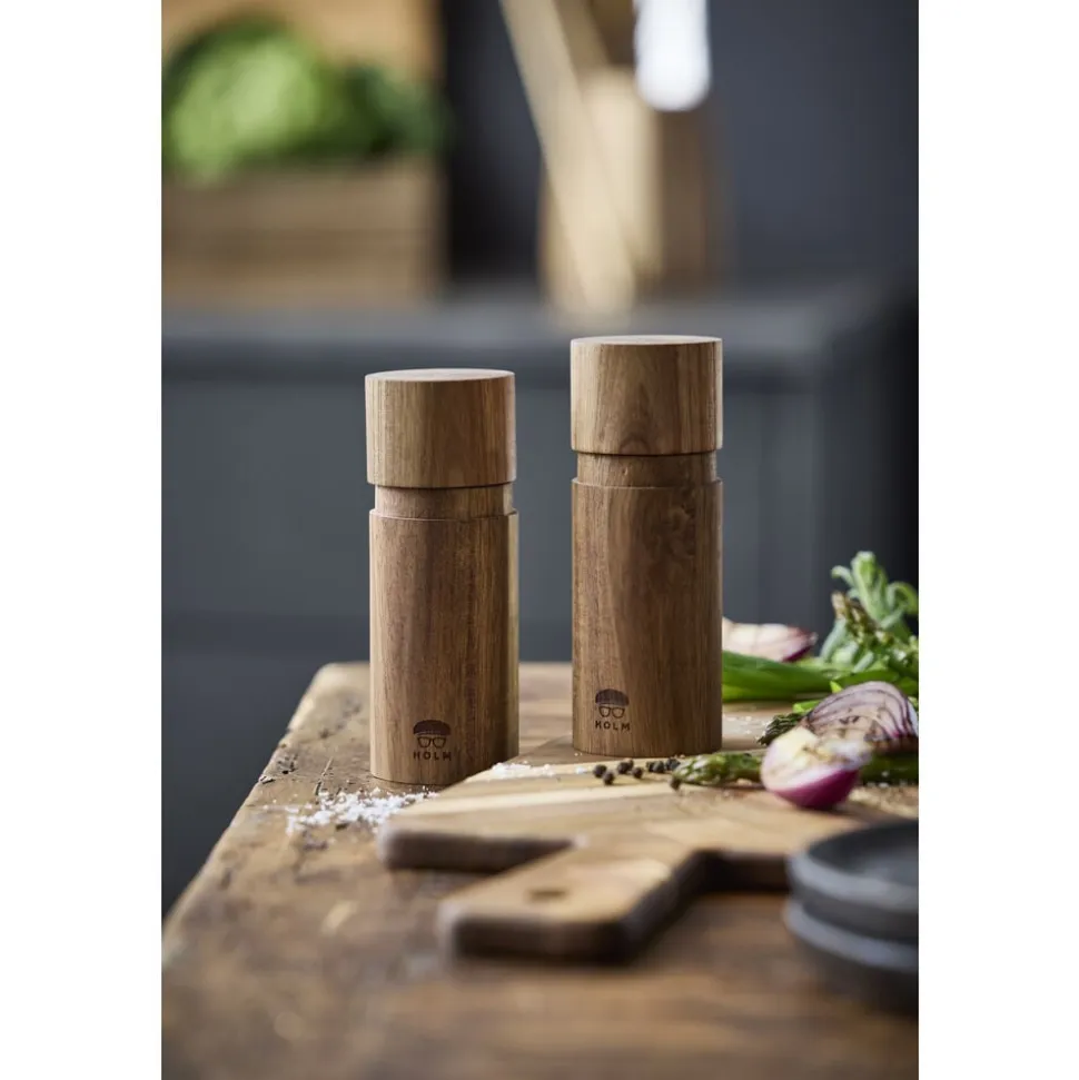 Flot salt- og peberkværnsæt i akacietræ med keramisk kværnindsats. Kværnene har et maskulint udtryk, og deres indhold af salt og peber er markeret med et diskret S eller P på toppens. Du kan selv bestemme, hvor groft eller fint du ønsker at kværne. Malingsgraden justeres nemt i bunden af kværnen.