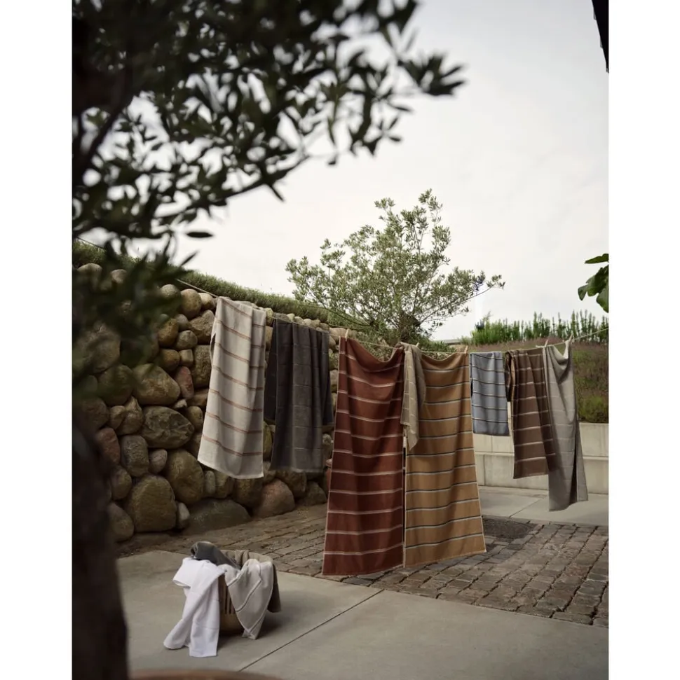 Sauna er navnet – og striberne taler for sig selv. Serien er inspireret af de stramme linjer i en klassisk træbeklædt sauna, hvor designet leger elegant med perspektiv og farvebalance. Hver side af håndklædet fremhæver sin egen dominerende farve – en fin detalje, der giver dig to forskellige udtryk i ét og samme håndklæde