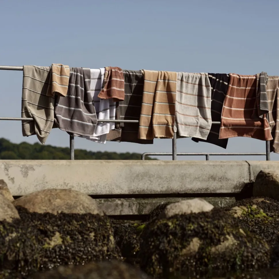 Sauna er navnet – og striberne taler for sig selv. Serien er inspireret af de stramme linjer i en klassisk træbeklædt sauna, hvor designet leger elegant med perspektiv og farvebalance. Hver side af håndklædet fremhæver sin egen dominerende farve – en fin detalje, der giver dig to forskellige udtryk i ét og samme håndklæde