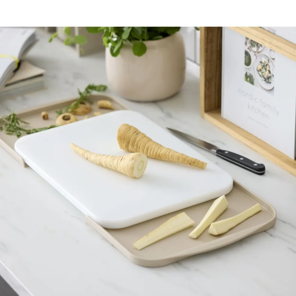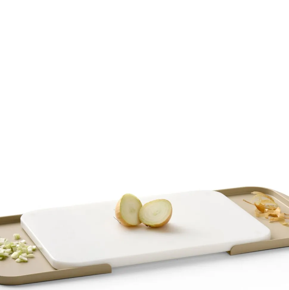 Separa bringer et professionelt skærebræt ind i det private hjem. Separa-konceptet består af et solidt og holdbart skærebræt, som hviler i to bakker. Skærebrættet er skåret ud af en blok af hård plastik (hdpe), der er hygiejnisk og meget stabilt. Materialet bruges i professionelle køkkener, da det er skånsomt mod knive, har lav fugtabsorption og er modstandsdygtigt over for syrer og baser. Separa gør hverdagen nemmere og hjælper dig let og intuitivt med at holde de friskhakkede råvarer og affaldet adskilt, når du går i køkkenet og tilbereder maden. Det er ganske enkelt: Affald til den ene side og friskhakket til den anden side i hver sin bakke, der er lige lette at tømme.