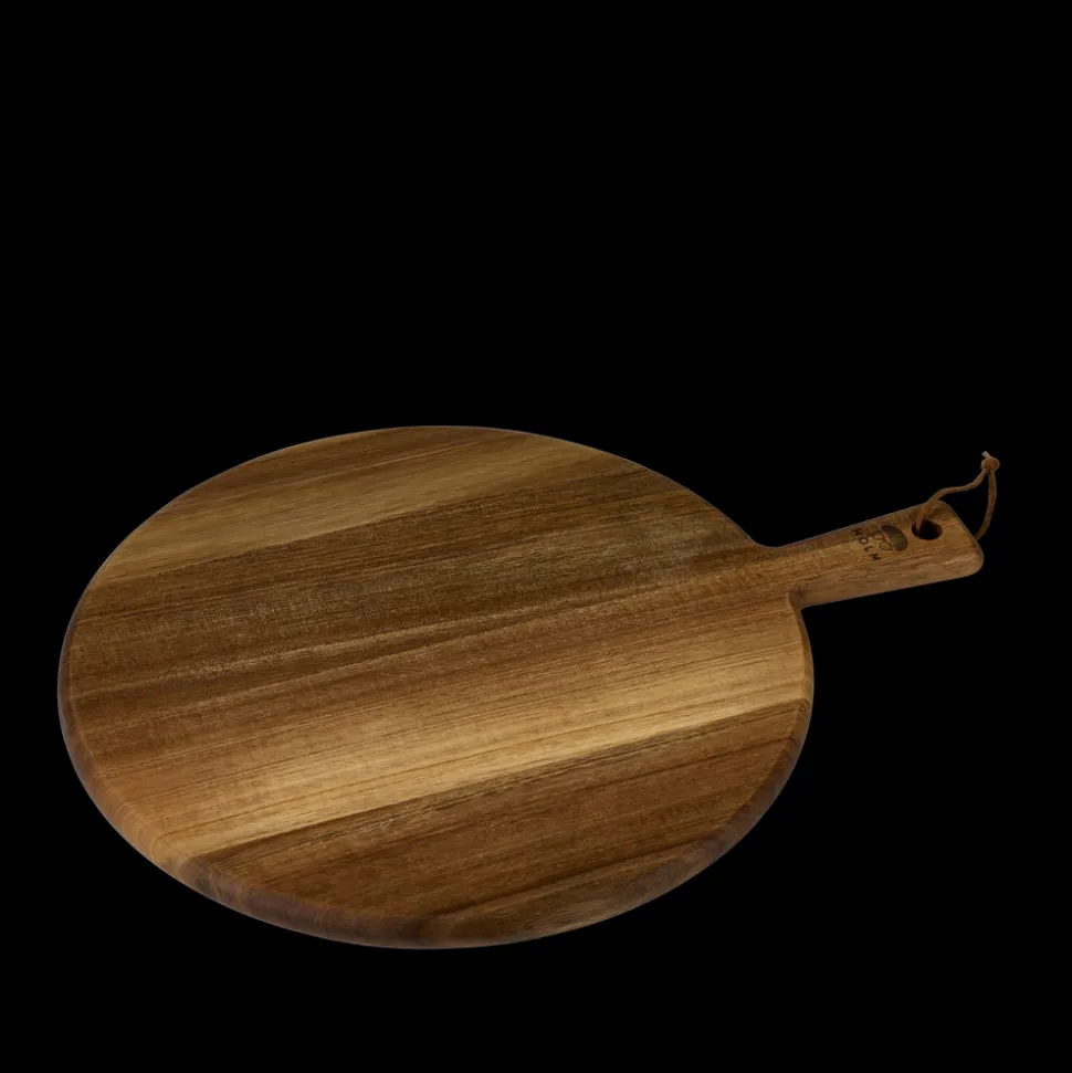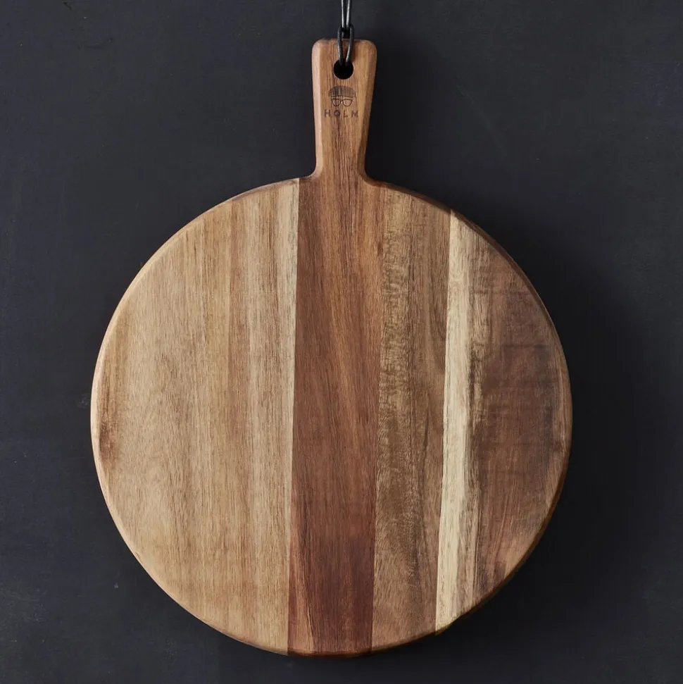 Rundt serveringsbræt i akacietræ. Kan bruges til servering af pizza, antipasti-retter og anden slags pålæg. Læg aldrig dit serveringsbræt i blød. Vaskes med varmt vand og mild sæbe. Brættet kan med fordel efterbehandles med madolie et par gange om året. Tåler ikke maskinopvask.