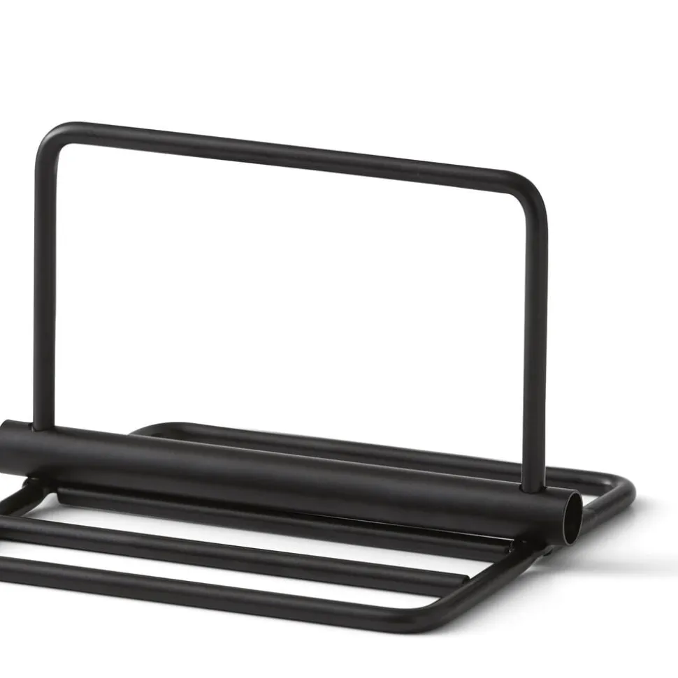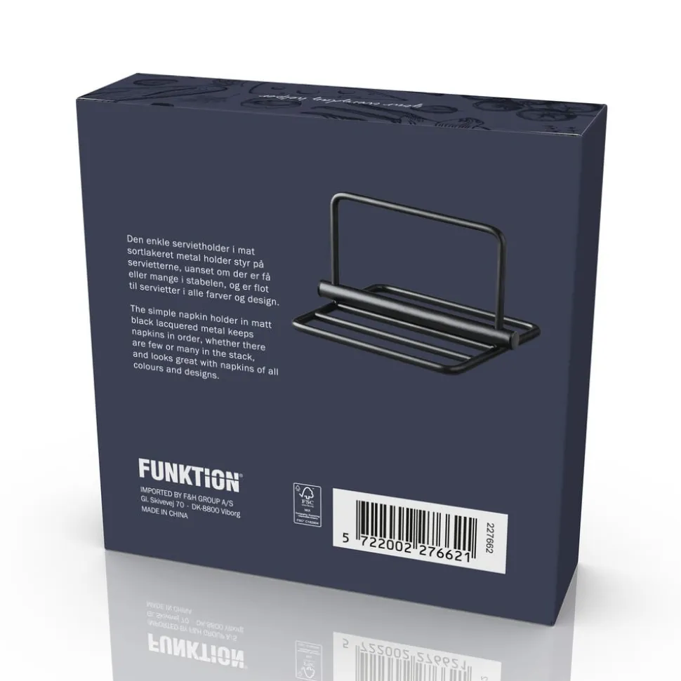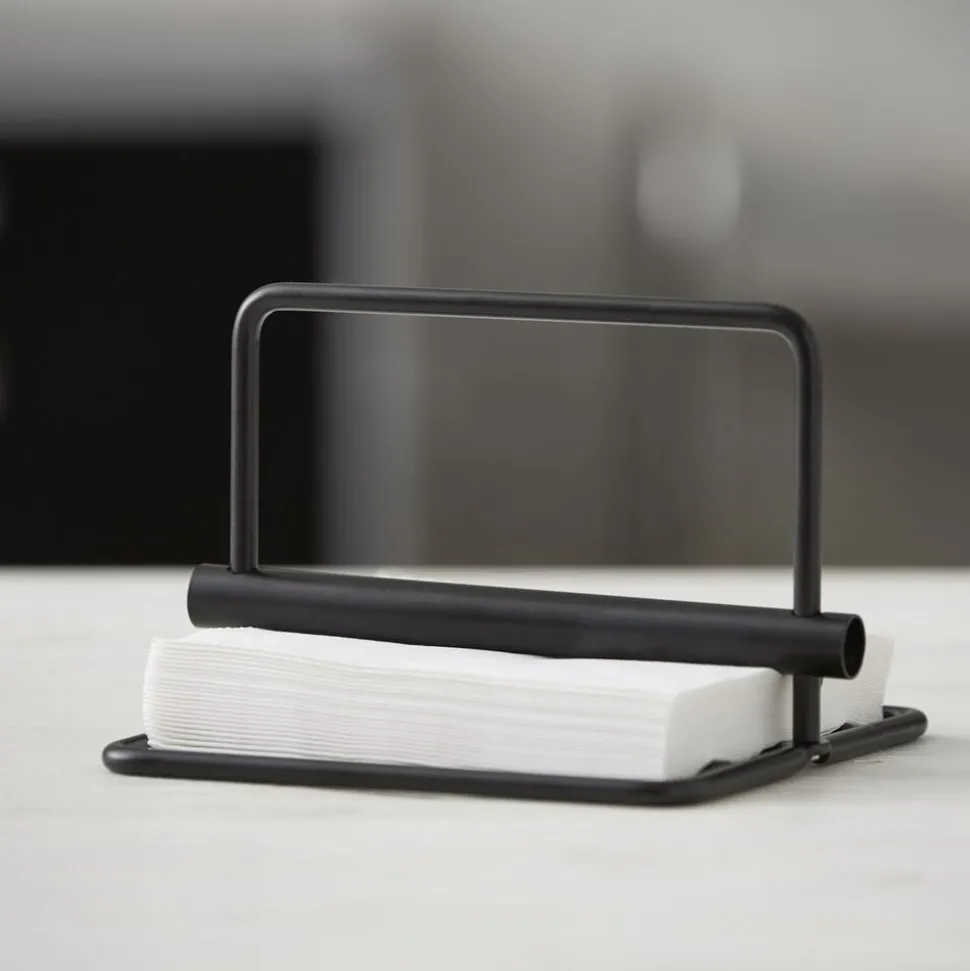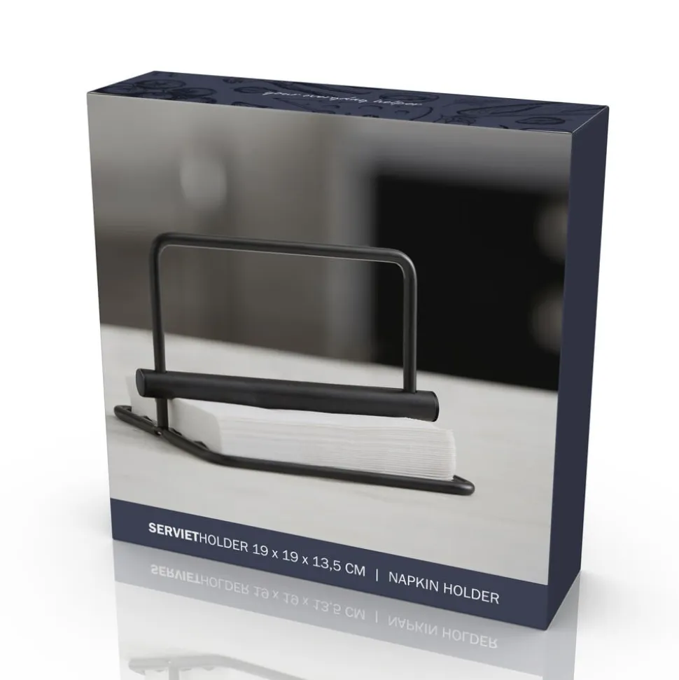 Den enkle servietholder i mat sortlakeret metal holder styr på servietterne, uanset om der er få eller mange i stabelen, og er flot til servietter i alle farver og design. Holderen måler 19 x 19 cm og er 13,5 cm høj.