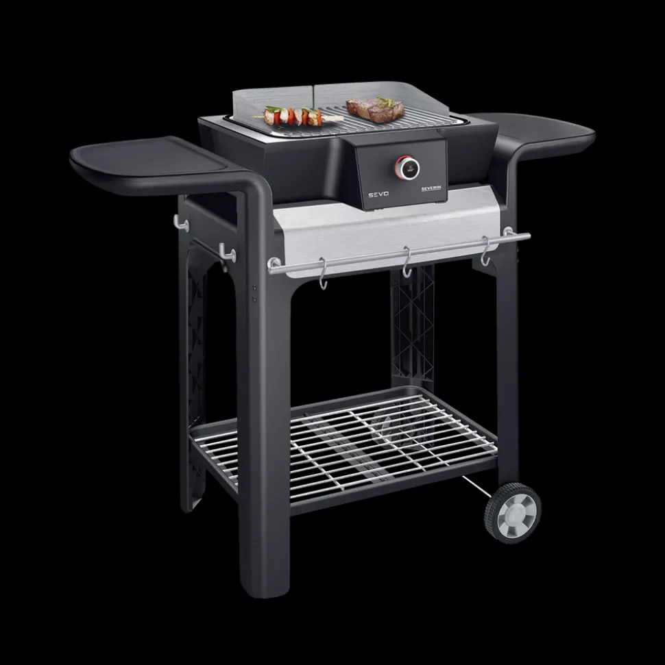 Elektrisk grill med ben, opbevaringshylde og sideborde, digitalt OLED-display og intregreret kernetermometer. Med Safetouch-kabinettet kan grillen bruges på alle overflader. Boost-funktionen giver hurtig grillstart fra 0 til 500 grader på kun 10 minutter. Let at skille ad og rengøre. 3000 watt.