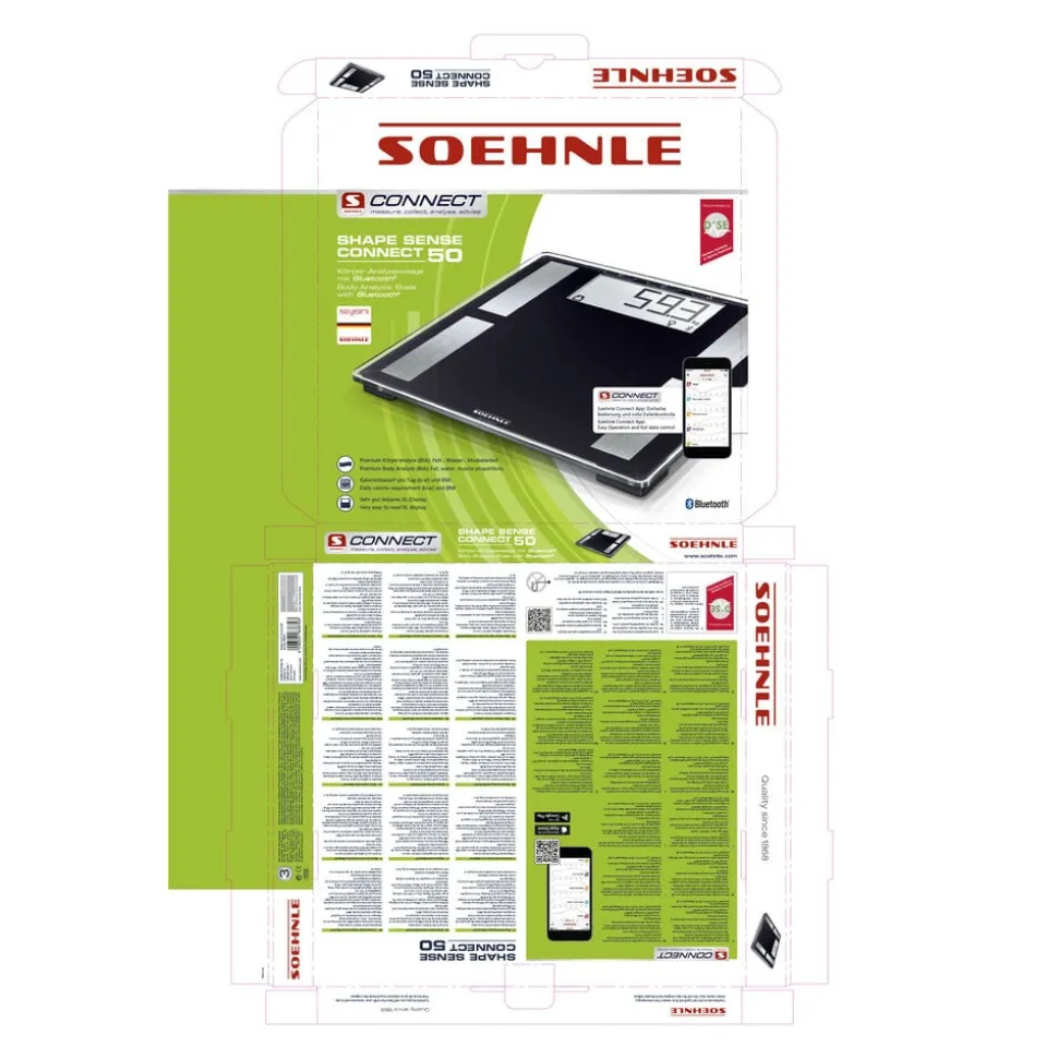 Vægten sender dine målinger til Soehnles egen S-Connect app, der er tilgængelig til iOS og Android, hvor du blandt andet kan indtaste din ønskevægt og få et nemt og overskueligt overblik. Du kan se din vægt, fedt- og væskeprocent, analyse af din muskelmasse og det anbefalede daglige kalorieindtag, forskellen i forhold til sidste vejning og hvor langt du har igen til ønskevægten. Du kan også se din BMI og forskellen i forhold til det gennemsnitlige BMI.