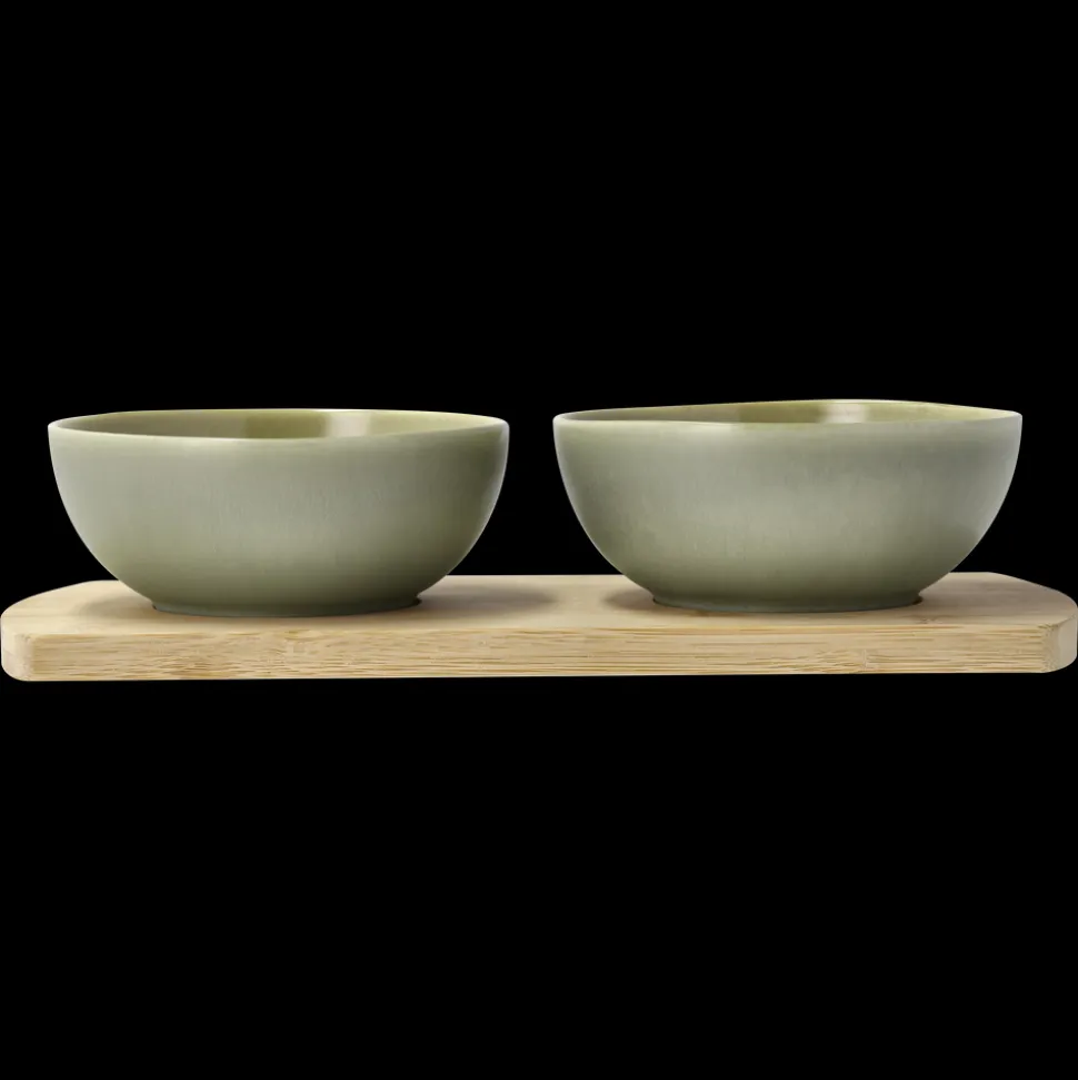 Shoku-bambusbakken med to skåle giver dig en stilfuld løsning til servering af mindre anretninger. Den naturlige bambus kombineret med de smukke skåle skaber en varm og harmonisk atmosfære ved bordet. Skålene er egnede til mikroovn og ovn op til 220 grader og kan vaskes i opvaskemaskine, mens bambusbakken skal vaskes i hånden.