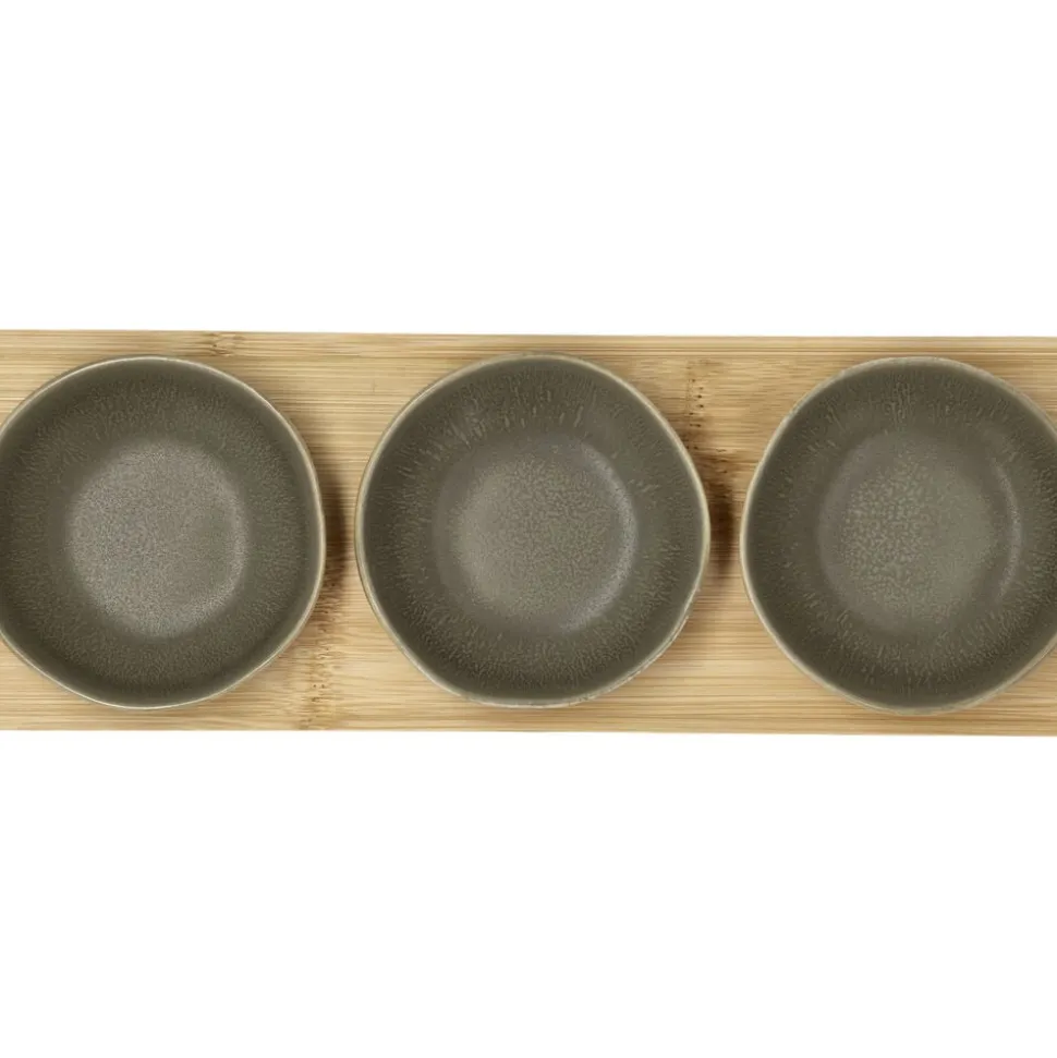 Denne bambusbakke med tre skåle er perfekt til servering af snacks, dips eller små forretter. Materialerne bambus og stentøj kombineret med Shoku-designets enkle linjer gør den ideel til både daglig brug og særlige lejligheder. Skålene er egnede til mikroovn og ovn op til 220 grader og kan vaskes i opvaskemaskine, mens bambusbakken skal vaskes i hånden.
