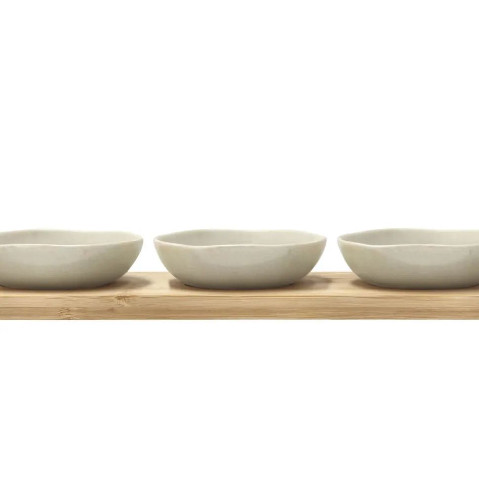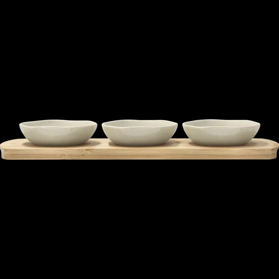 Denne bambusbakke med tre skåle er perfekt til servering af snacks, dips eller små forretter. Materialerne bambus og stentøj kombineret med Shoku-designets enkle linjer gør den ideel til både daglig brug og særlige lejligheder. Skålene er egnede til mikroovn og ovn op til 220 grader og kan vaskes i opvaskemaskine, mens bambusbakken skal vaskes i hånden.