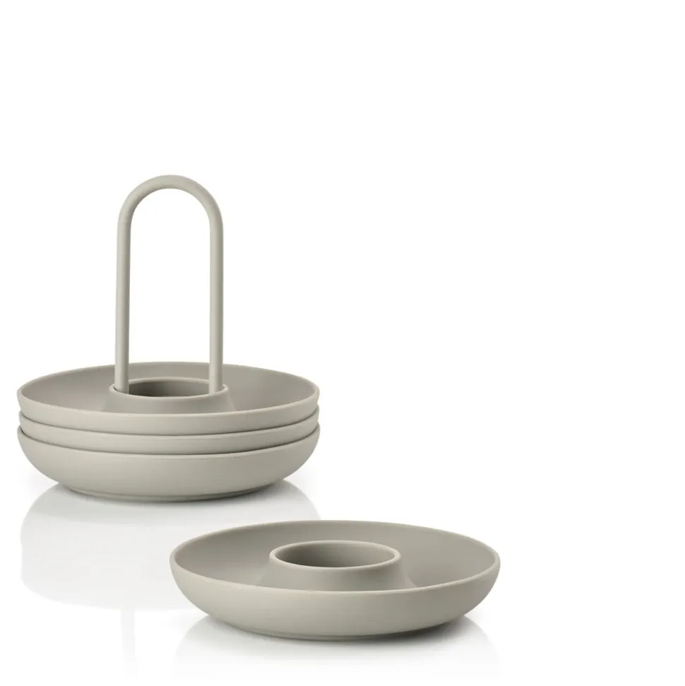 De fire æggebægre i holder fra Singles kan sættes på bordet med kun én hånd. Og den buede kant fanger både salt, æggeskaller og gæsternes opmærksomhed. Så kan du spise brunch med stil – fx i selskab med gode venner.