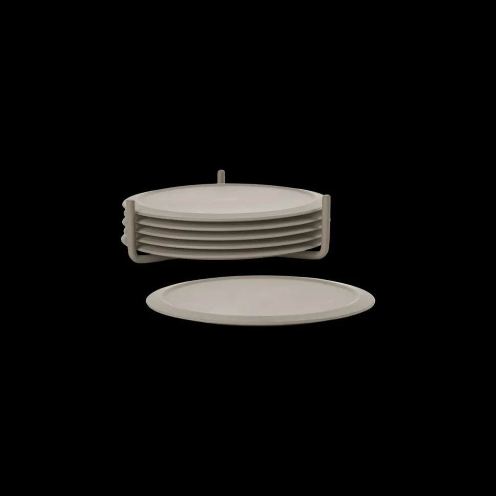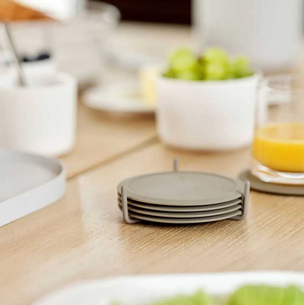 Flotte farvede glasbrikker i silikone. En blød og lydløs landing – sådan kan man bedst beskrive det, når man stiller et glas fra sig på glasbrikken i silikone. Leveres i sæt med seks glasbrikker i praktisk metalholder. Nemme at rengøre. D: 10 cm.