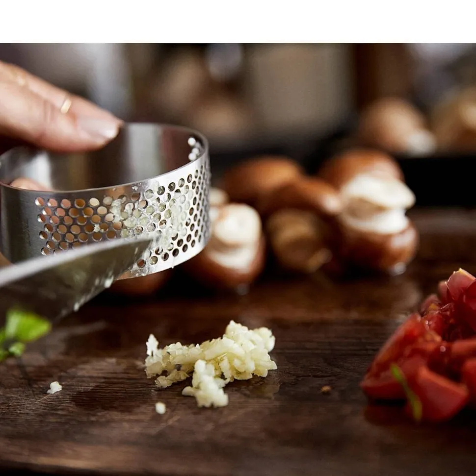 Forførende enkel – så kort kan man beskrive hvidløgspresseren fra Zone Denmark. Form og funktion følger hinanden i et smukt og effektivt redskab helt uden mekaniske dele. Det eneste, du skal gøre, er at rulle den hen over hvidløgsfeddet og skrabe det pressede hvidløg af ringens inderside. Efterfølgende renses hullerne nemt og hurtigt med en børste under rindende vand. Fremstillet i rustfrit stål.