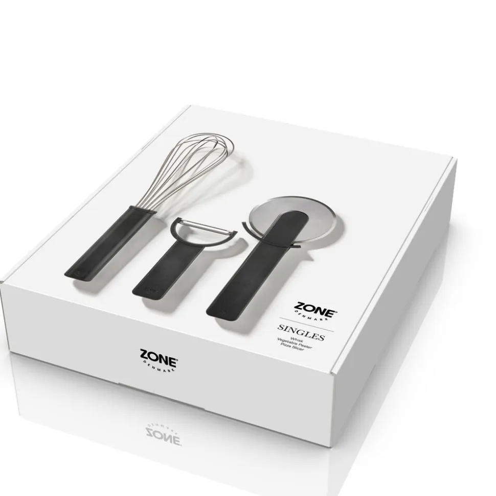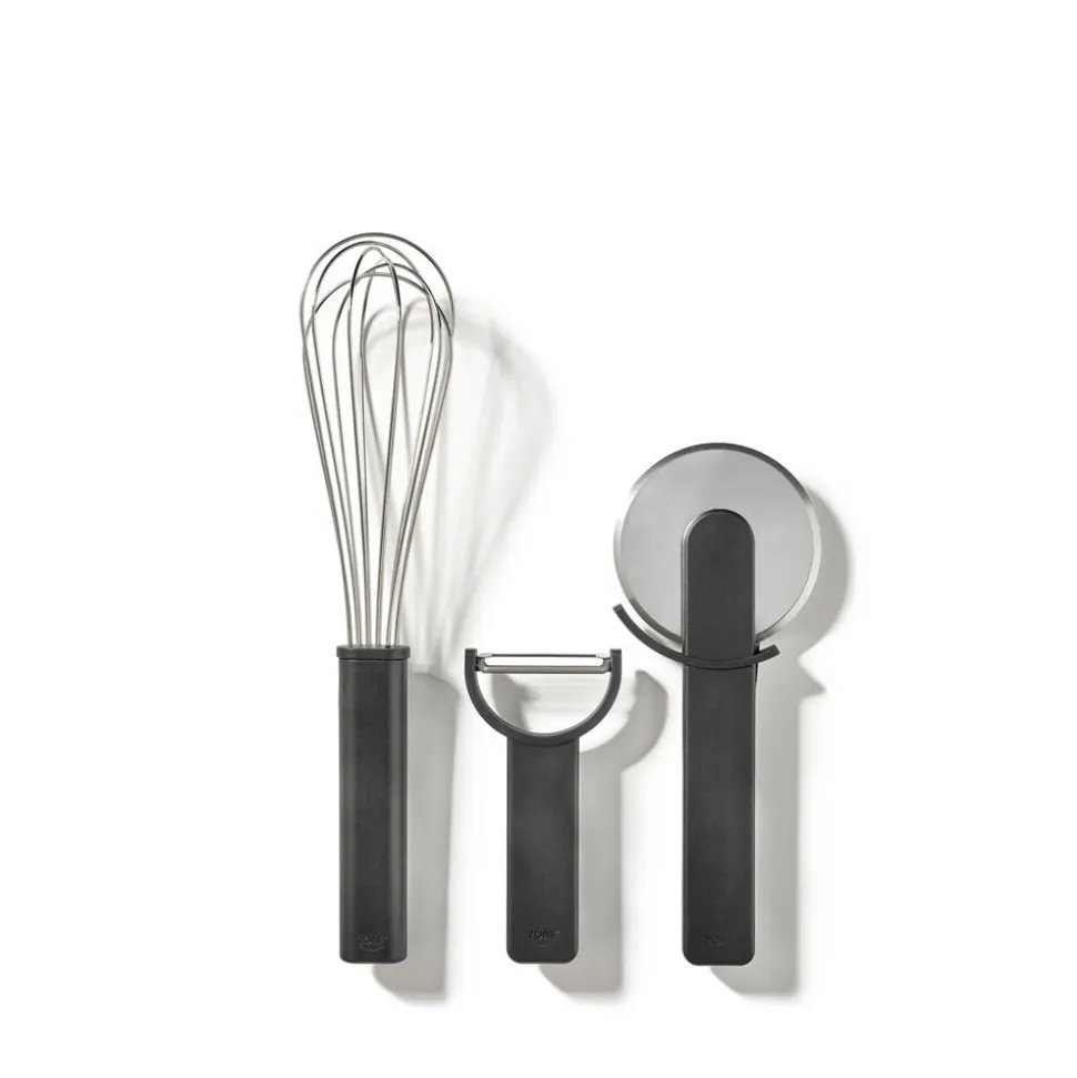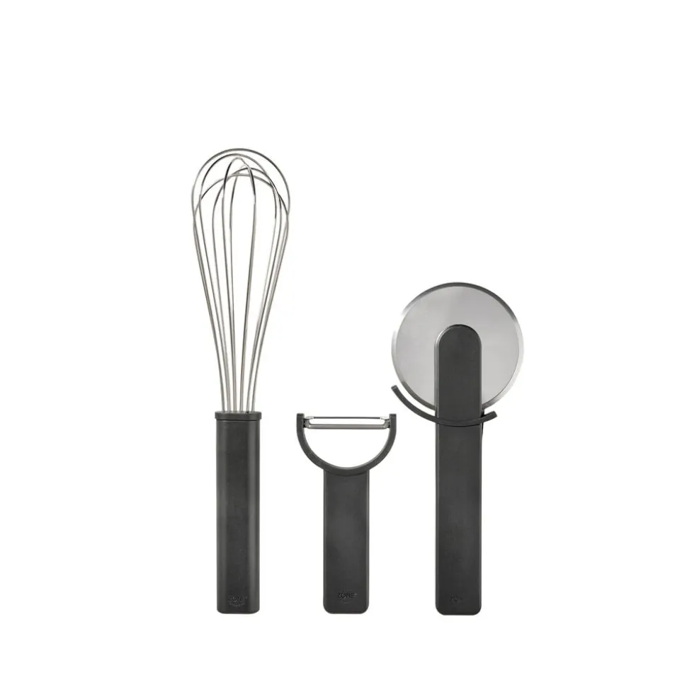 Køkkenredskabssættet består af 3 dele, piskeris, grøntsagsskræller og pizzahjul.
