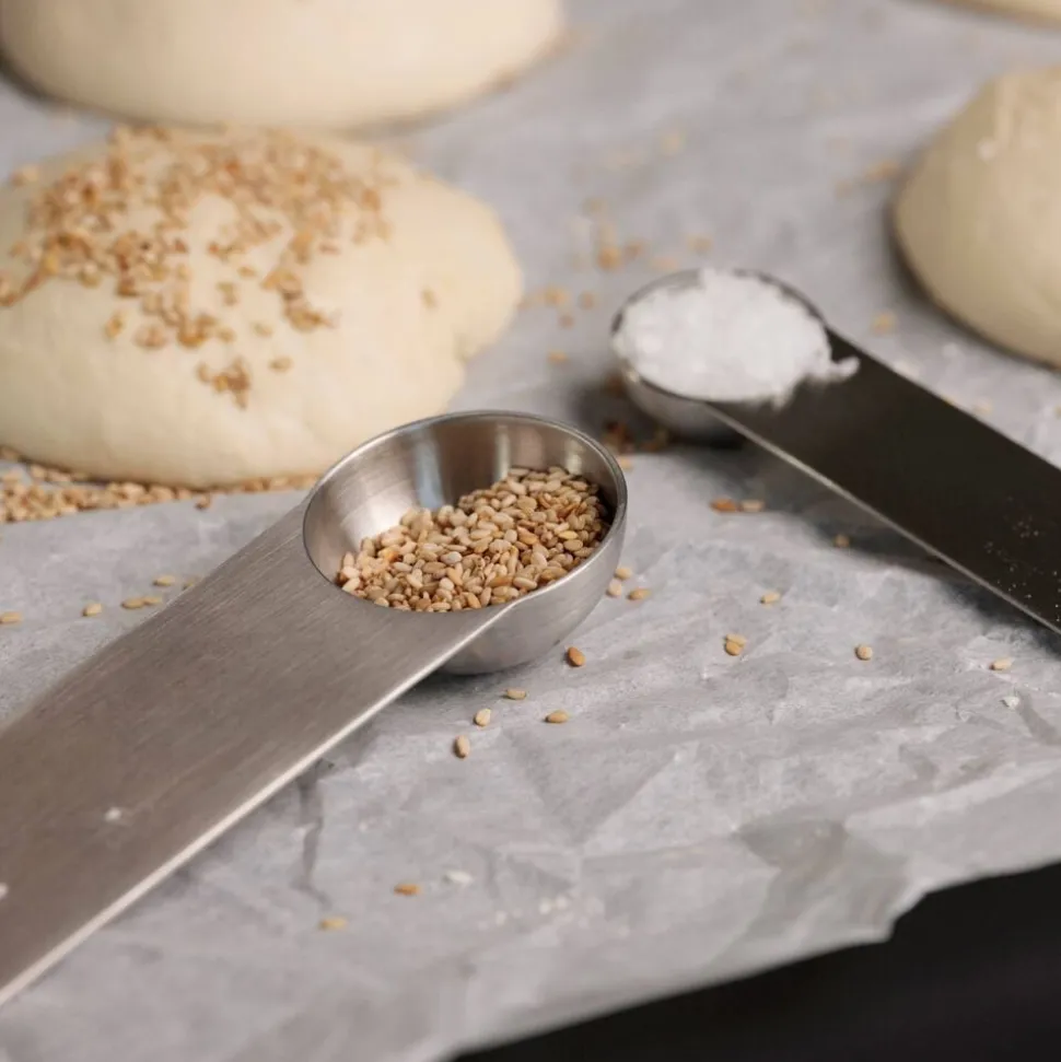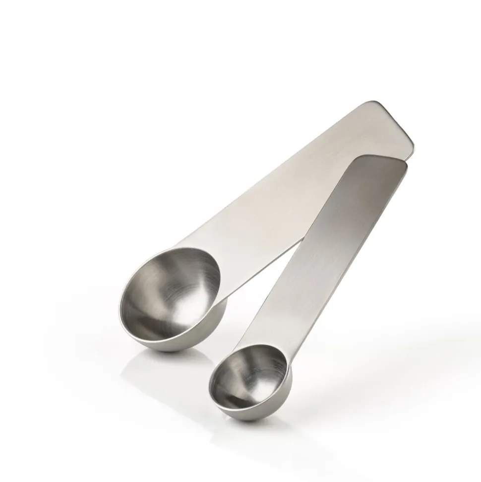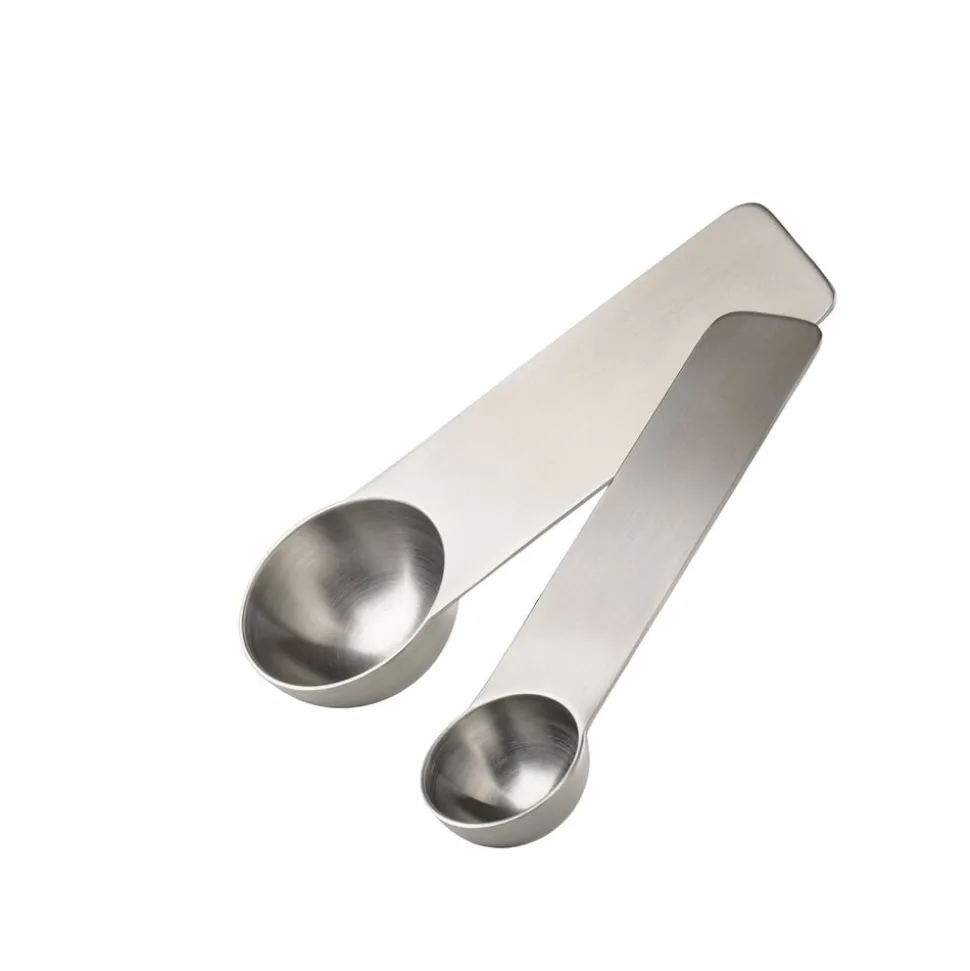 De to praktiske måleskeer i børstet stål er en gave for livet. Et uundværligt makkerpar for alle, der holder af at lave mad og bage. Teskeen og spiseskeen kan lægges i ske i skuffen, så de ikke fylder meget. Til gengæld gætter vi på, du vil bruge dem meget. Til kaffe, til krydderier, til hverdag og fest.
