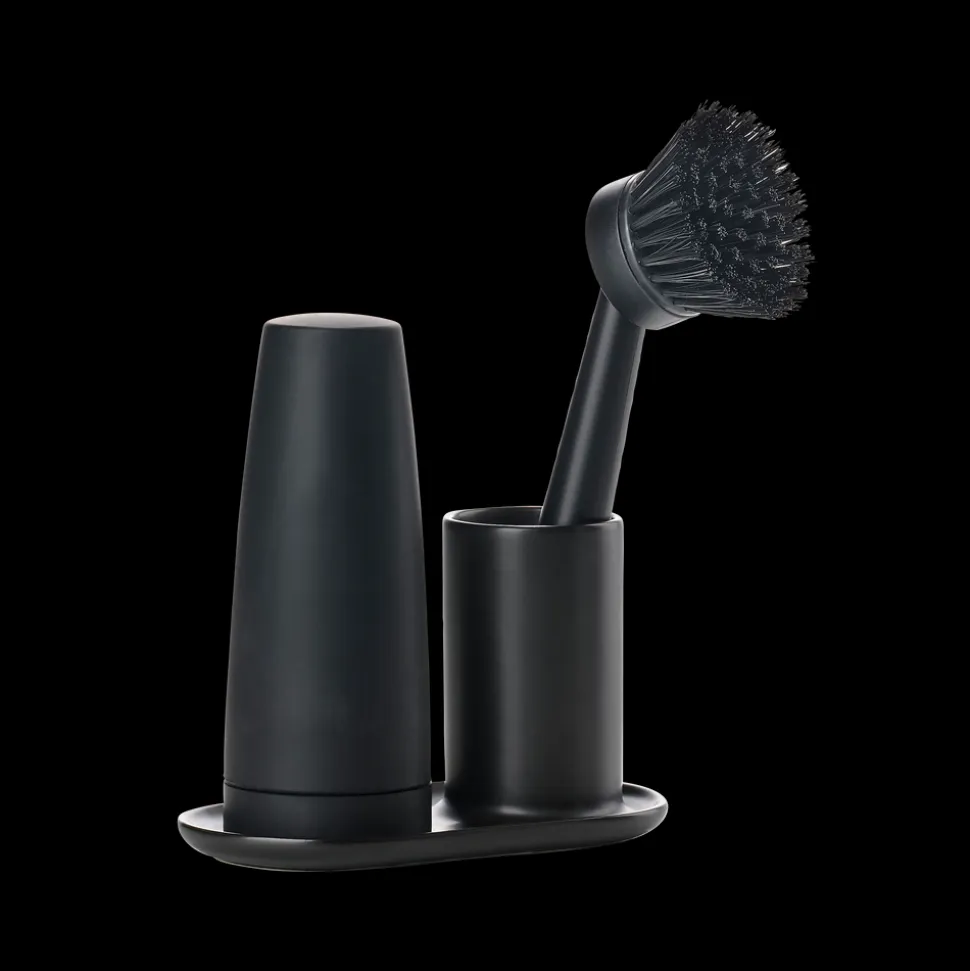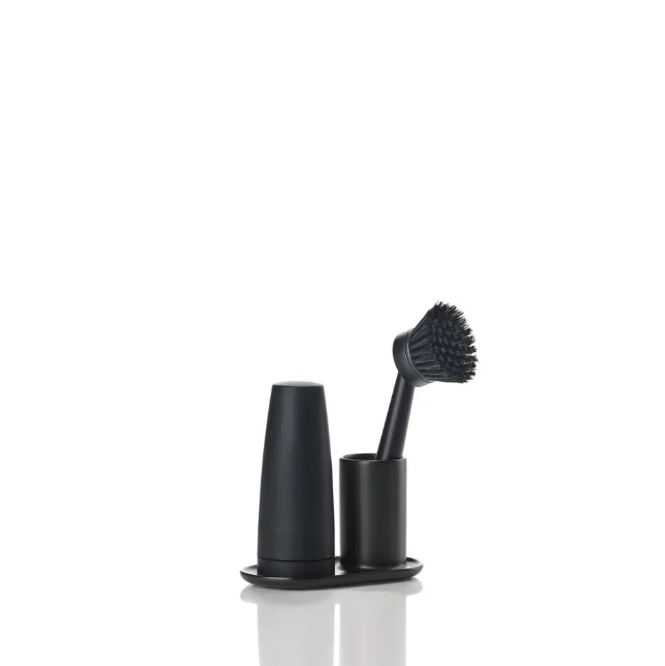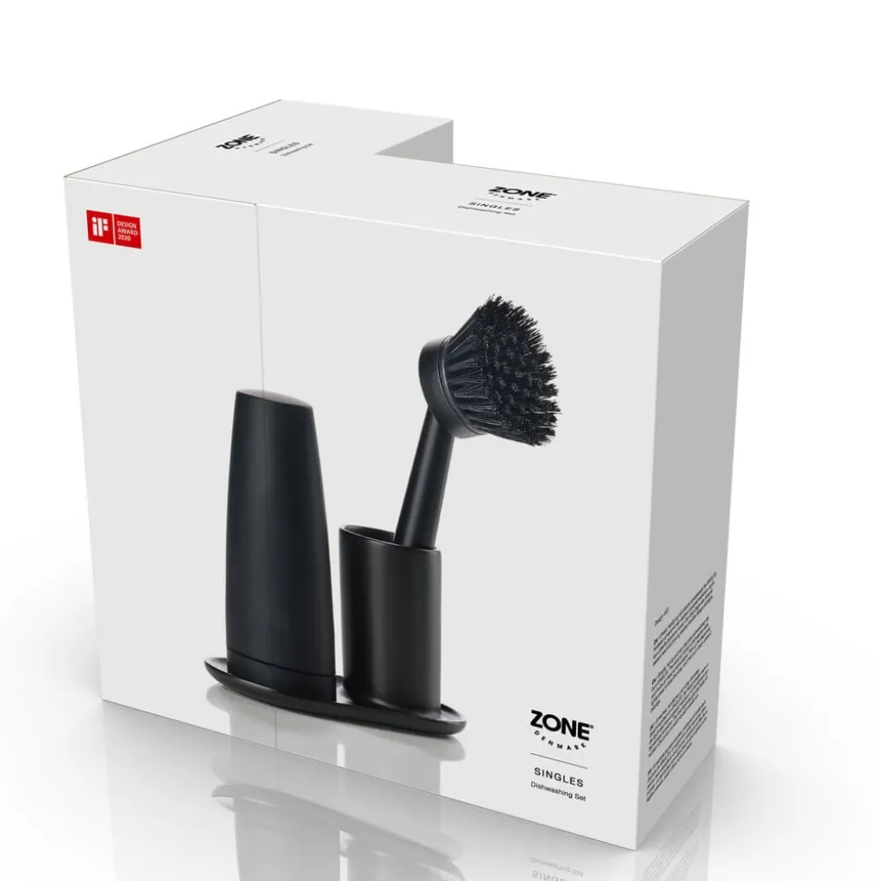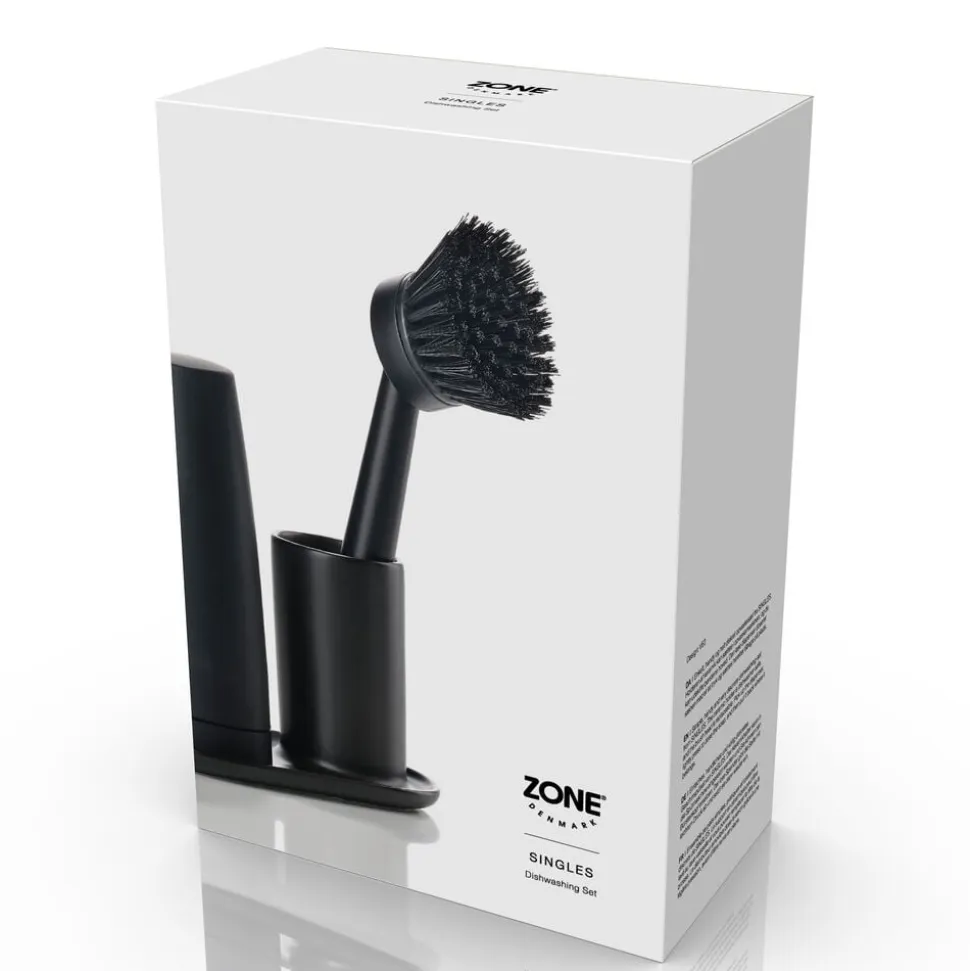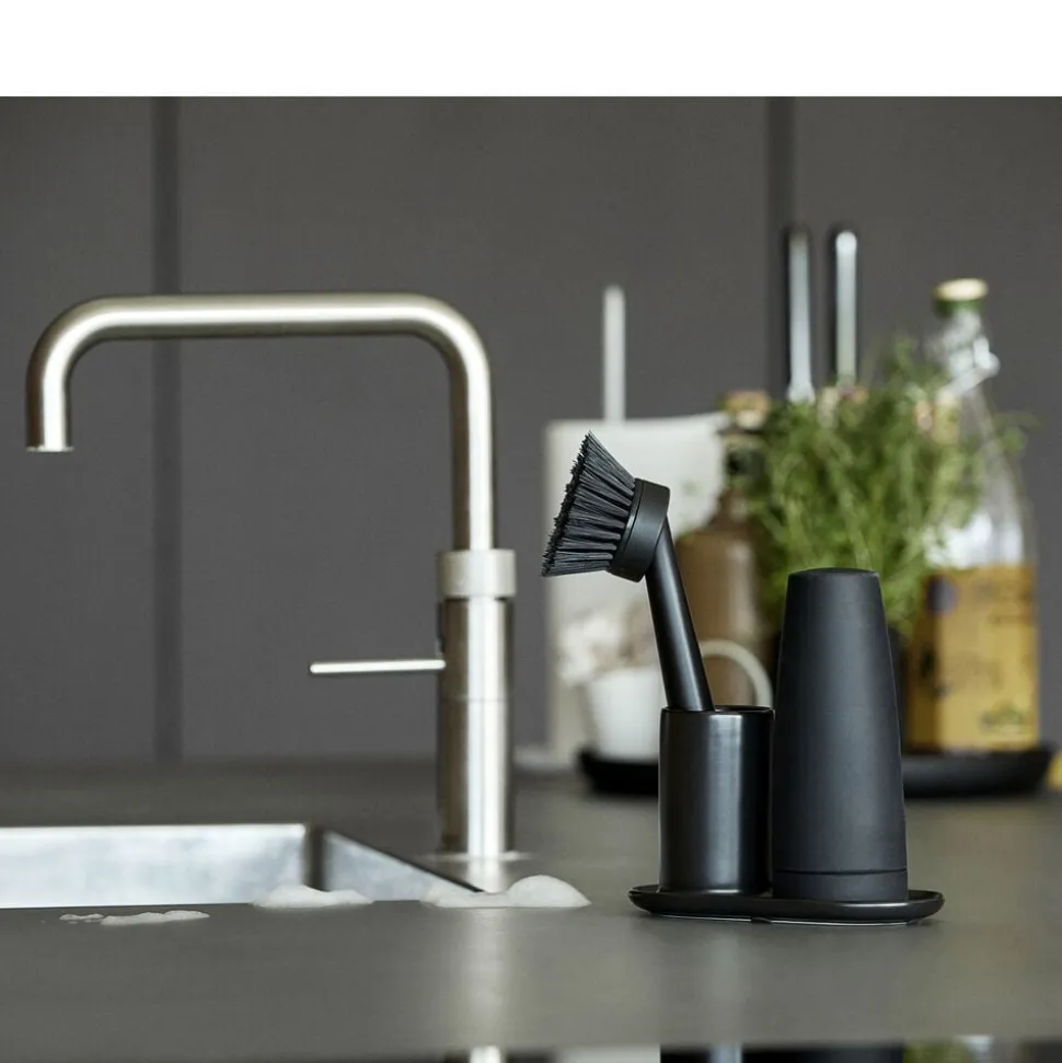 Enkelt, handy og helt diskret opvaskesæt fra Singles. Holderen af keramik kan sættes i opvaskemaskinen, og du kan udskifte børstens hoved. Den løse dispenser doserer sæben med et let tryk og sættes herefter tilbage på plads.