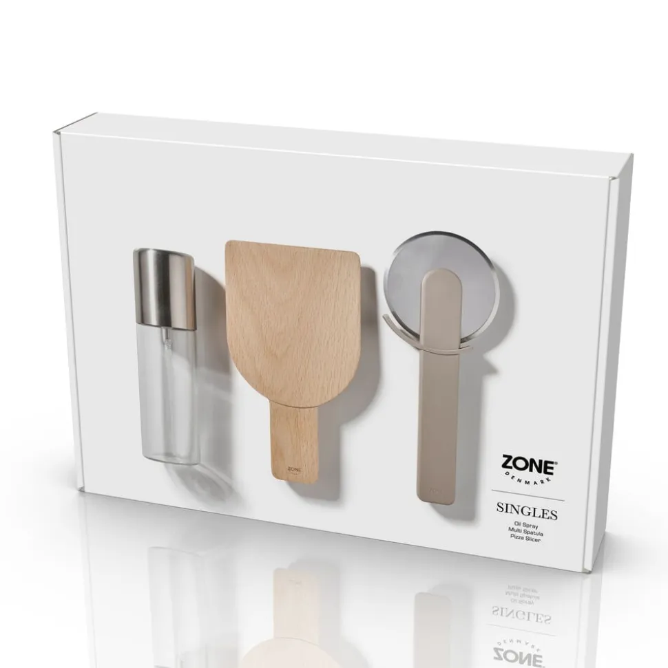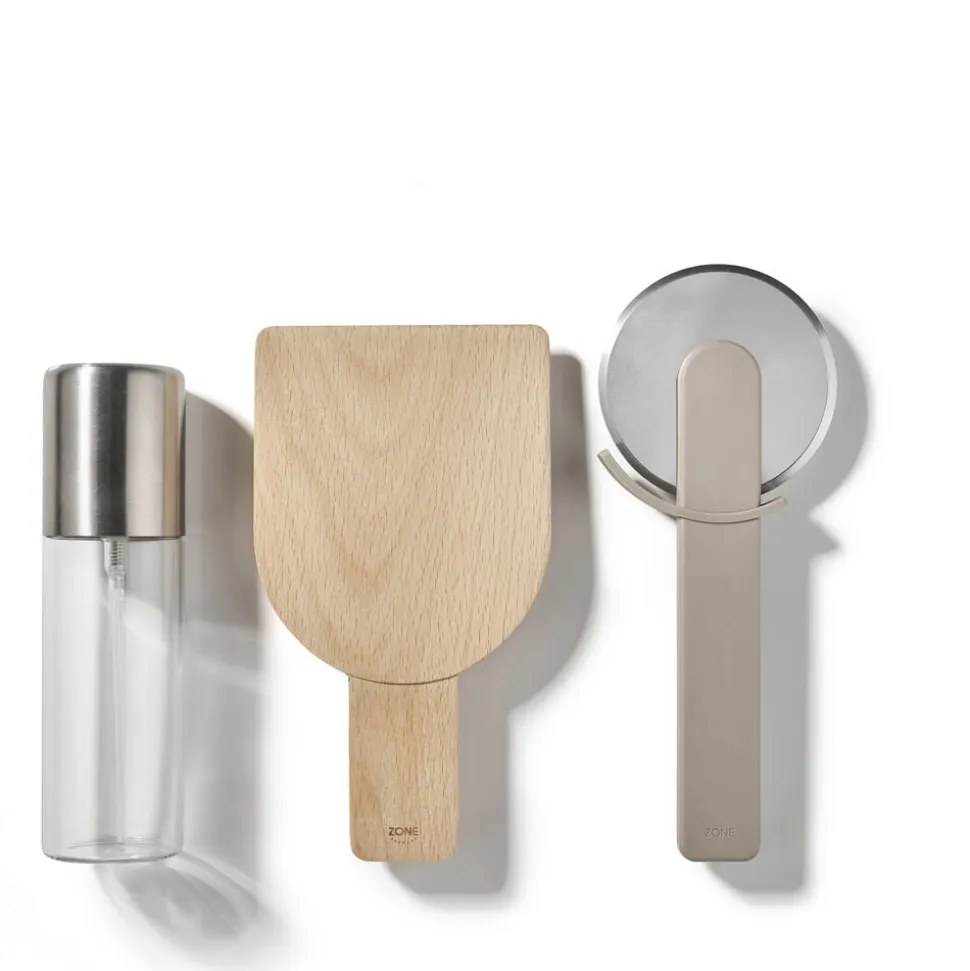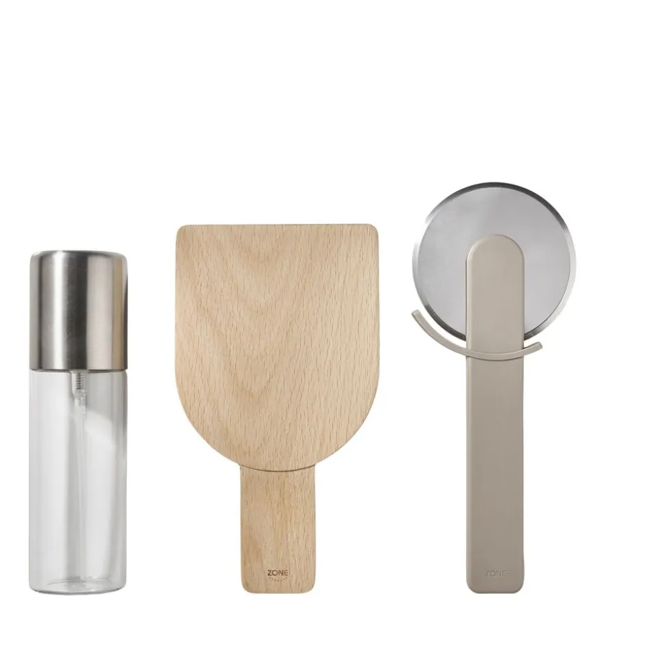 Pizzasættet består af 3 dele, Singles pizzahjul og Singles oliespray i Soft Taupe samt 18 x 10 cm multispatel i bøg.