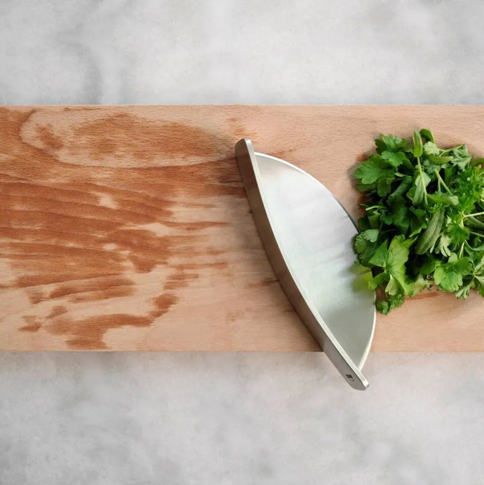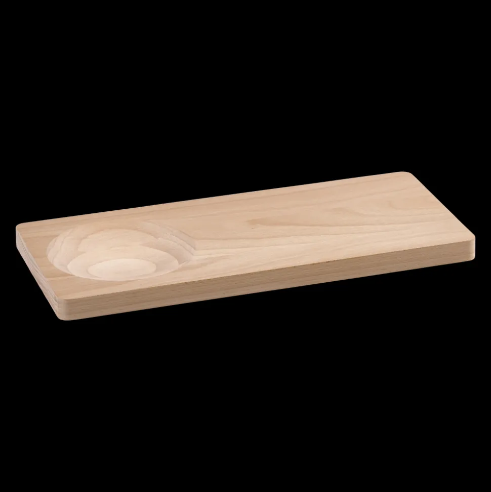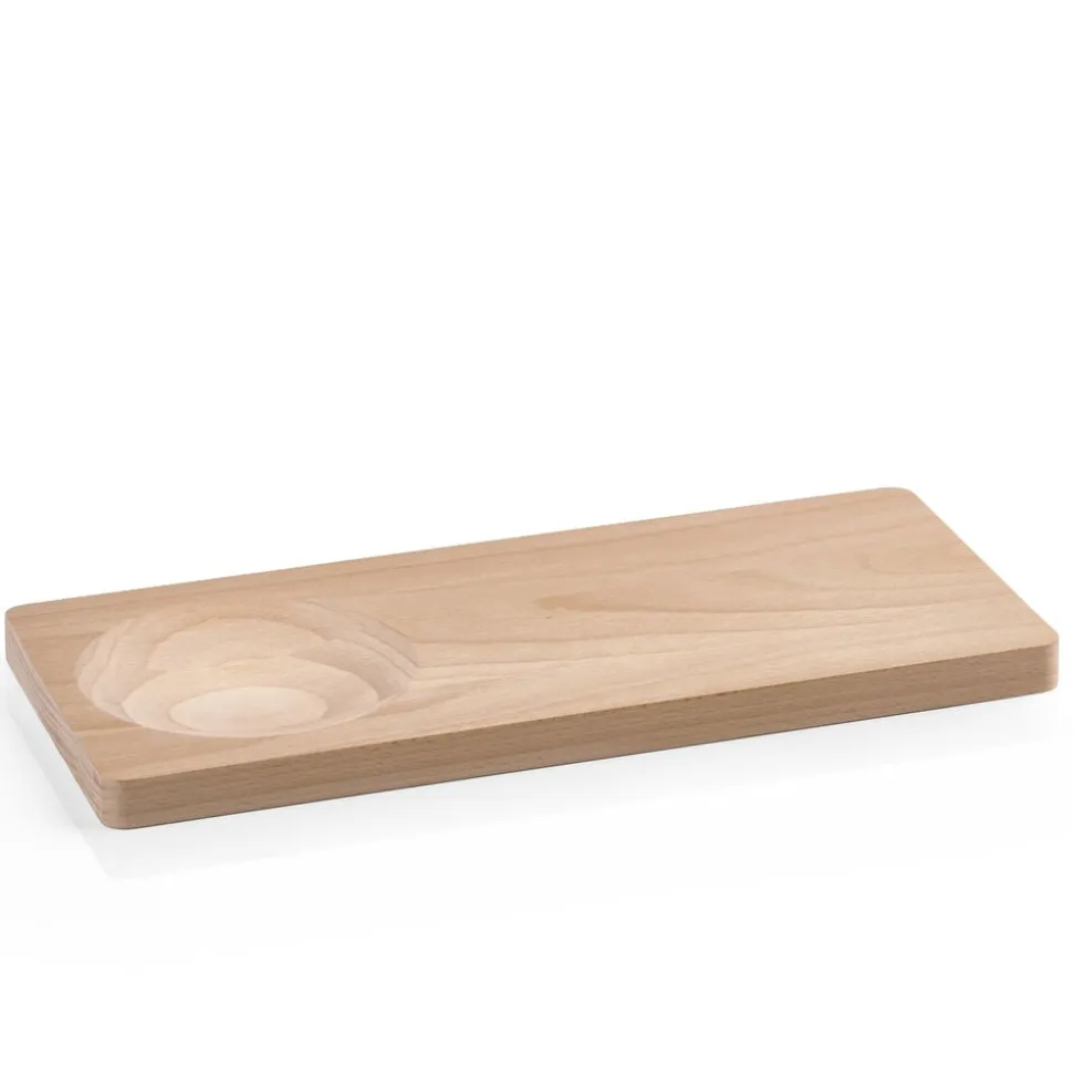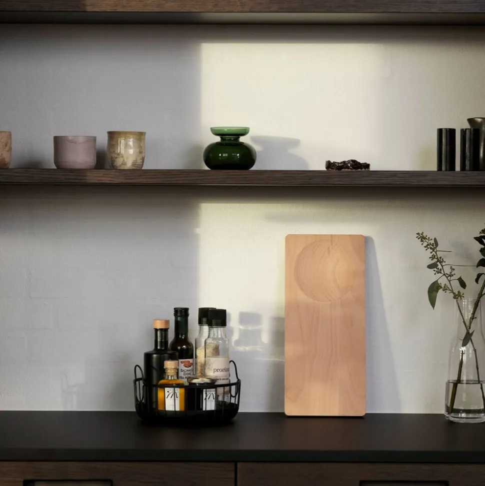 Smukt skærebræt i solid kvalitet udført i lyst bøgetræ. Brættet har et organisk udtryk med rundede hjørner og to forskellige sider. Den ene er traditionel og flad, mens den anden har en cirkelformet udhuling i den ene ende, der åbner for flere anvendelsesmuligheder. Brug brættet som tapasfad og placér en skål med nødder, olie eller dip i udhulingen. Du kan også bruge det til at hakke krydderurter i med hjælp fra vuggekniven i samme serie.