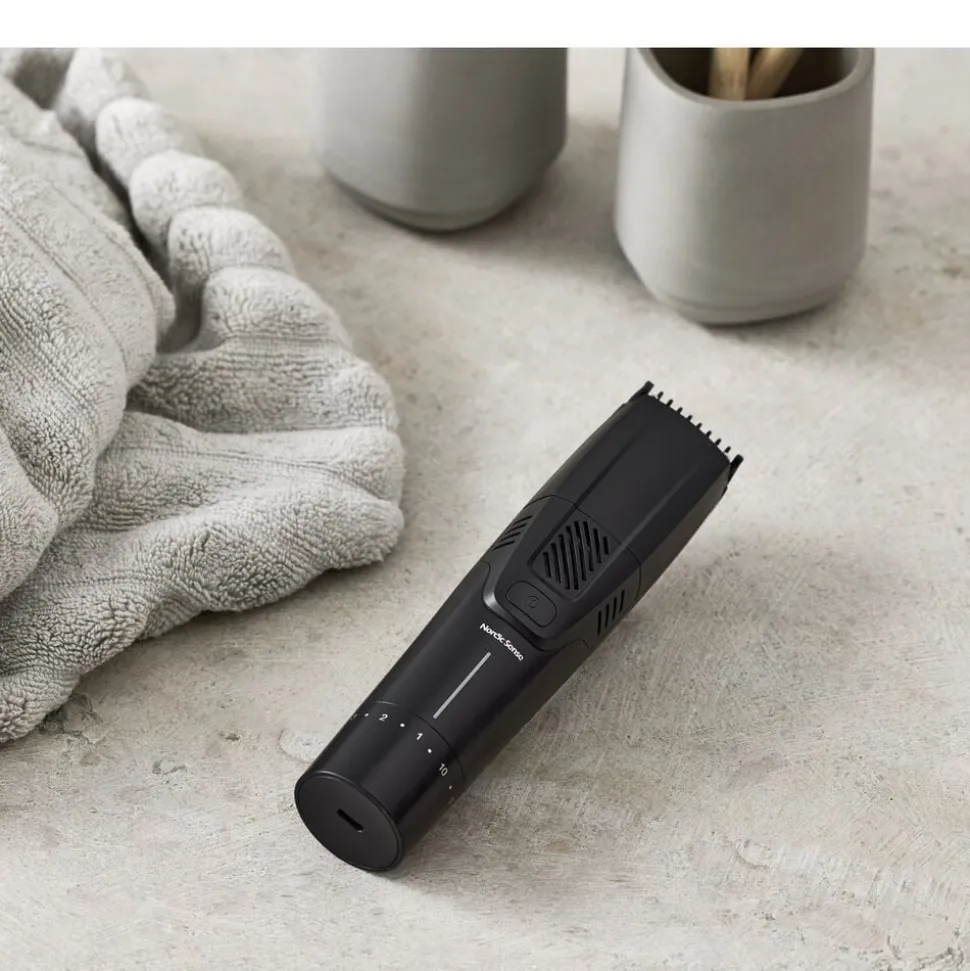 Skægtrimmer med sug hjælper med at holde håndvasken ren, mens du trimmer. Den integrerede vakuumfunktion opsamler skægstubbe under brug og holder vasken ren. Den skarpe keramiske klinge giver en præcis og skånsom trimning, mens de tre medfølgende afstandskamme gør det nemt at vælge den ønskede længde. Trimmeren er vandtæt og kan skylles under rindende vand for nem rengøring. Med en opladningstid på kun 2 timer får du op til 60 minutters brugstid. De separate betjeningsknapper til trimmer og sug giver fuld kontrol, og USB-C opladning gør det hurtigt og nemt at oplade. USB-C-kabel medfølger.