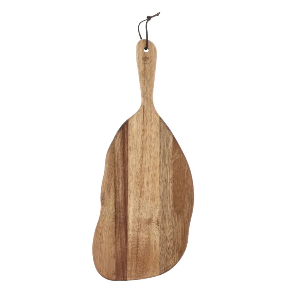 Serveringsbræt med bløde organiske former fremstillet i akacietræ. Brættet er ideelt til servering af ost, tapasretter og andre anretninger eller som skærebræt under tilberedning af måltidet. Med ophængshul og strop. 48 x 20,3 x 1,5 cm