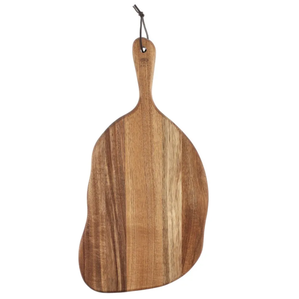 Serveringsbræt med bløde organiske former fremstillet i akacietræ. Brættet er ideelt til servering af ost, tapasretter og andre anretninger eller som skærebræt under tilberedning af måltidet. Med ophængshul og strop. 44 x 22,7 x 1,5 cm.