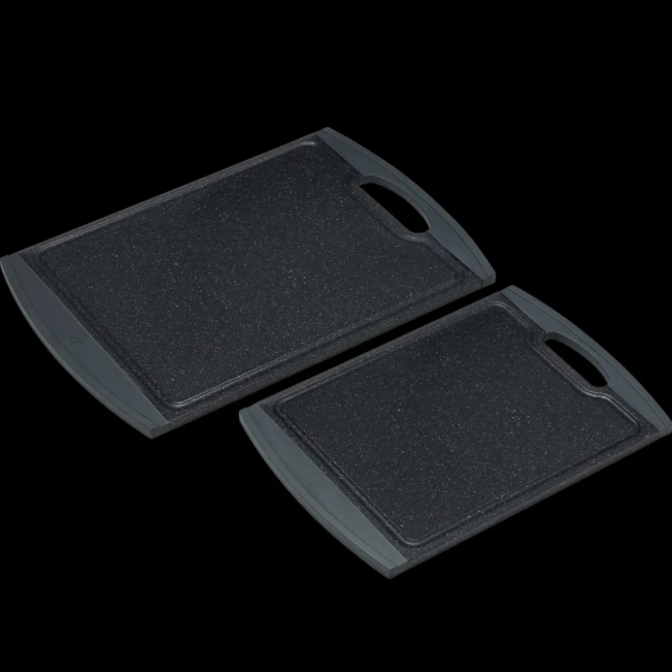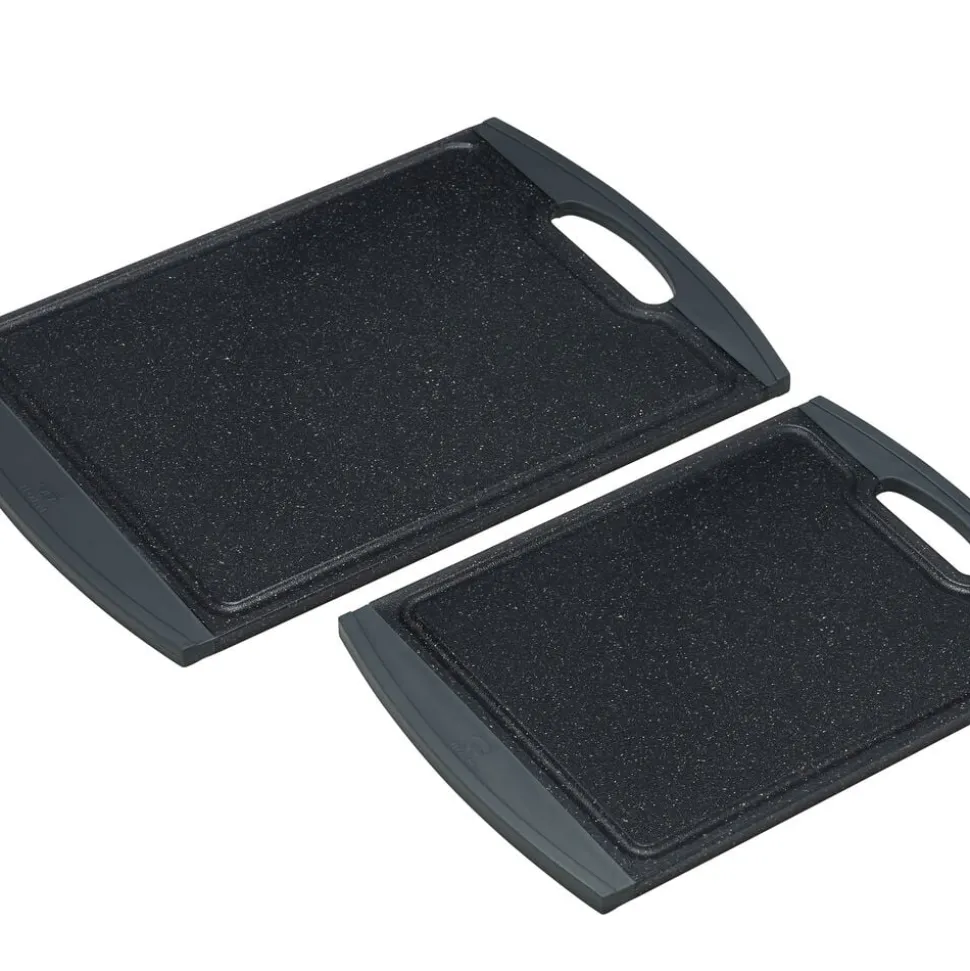 2 stk. skærebræt m/kant i grå gummi. Str.: 29,2×20,3×1 cm og 36,8×25,4×1 cm.