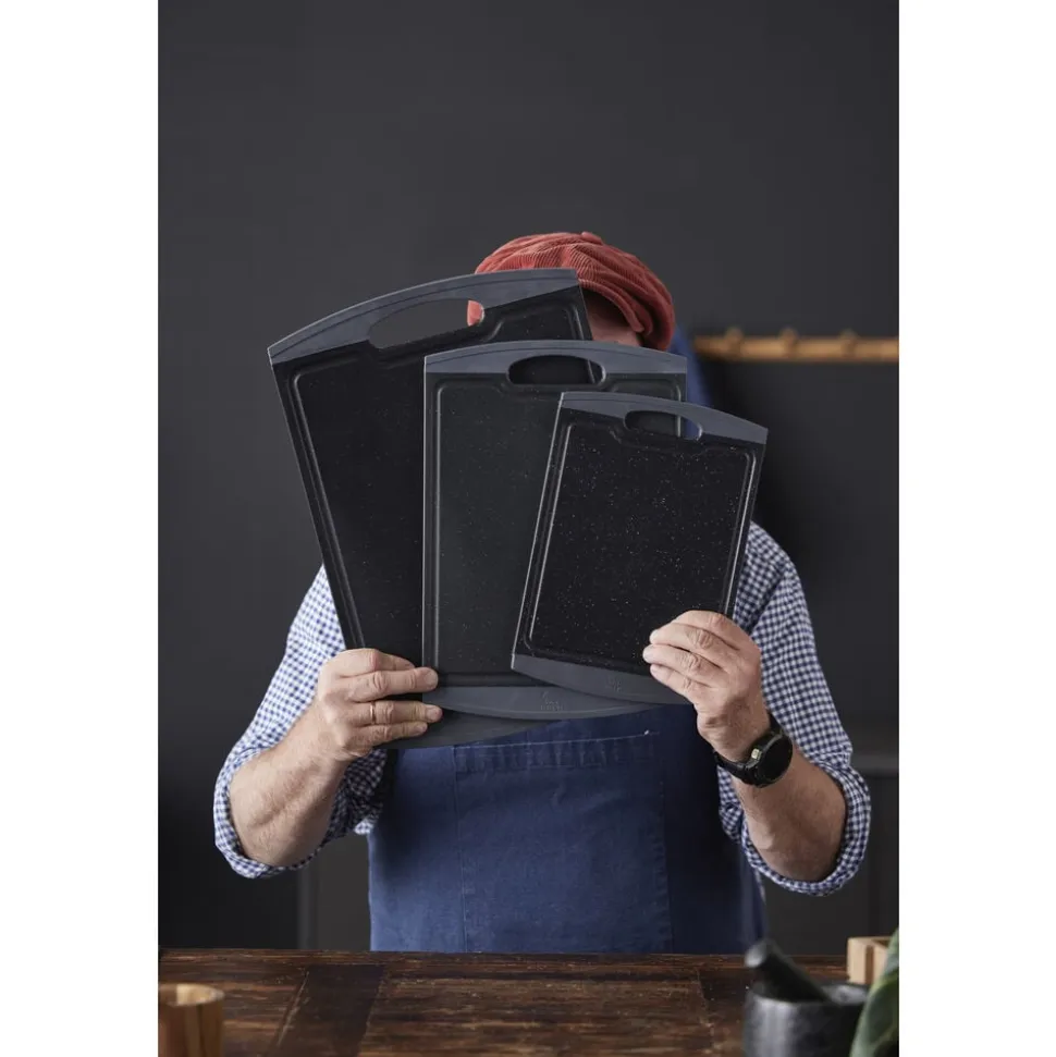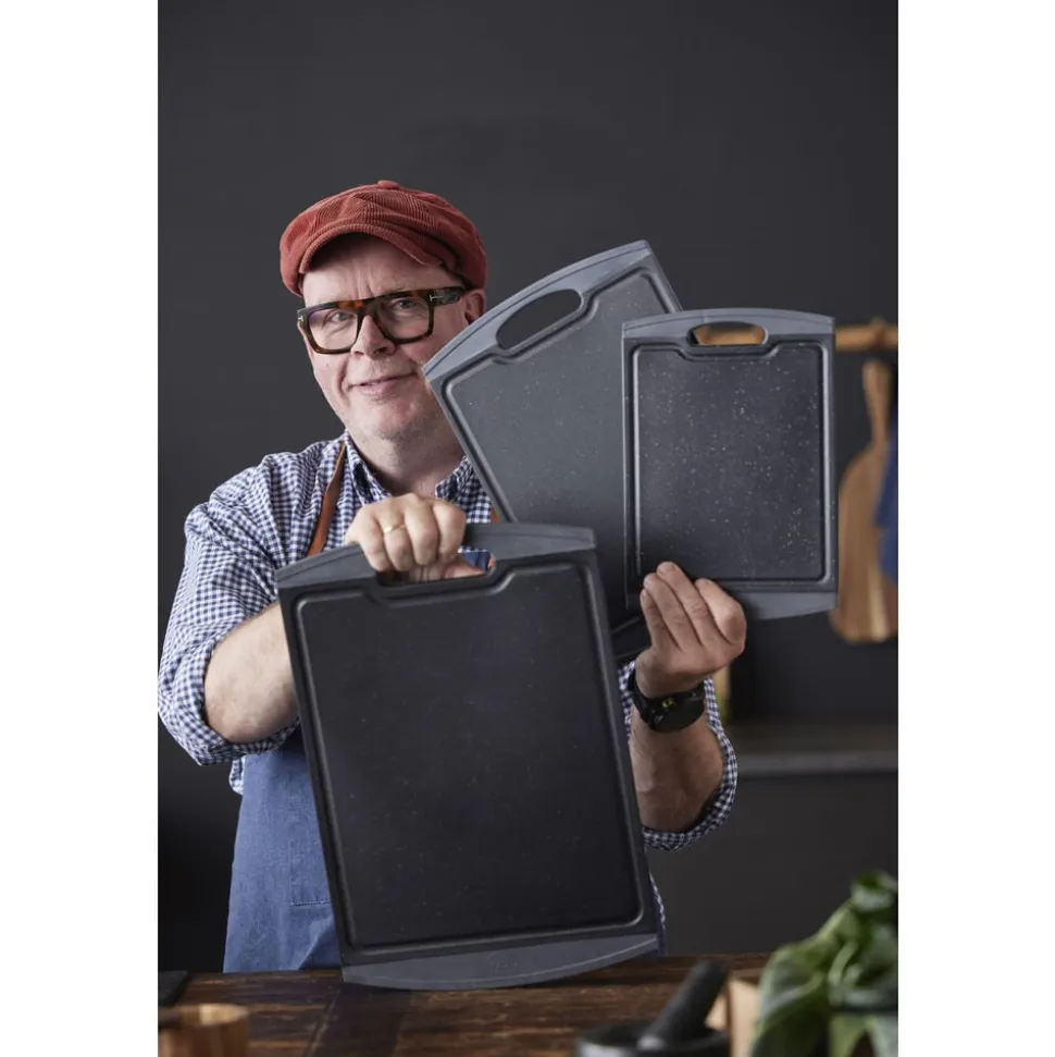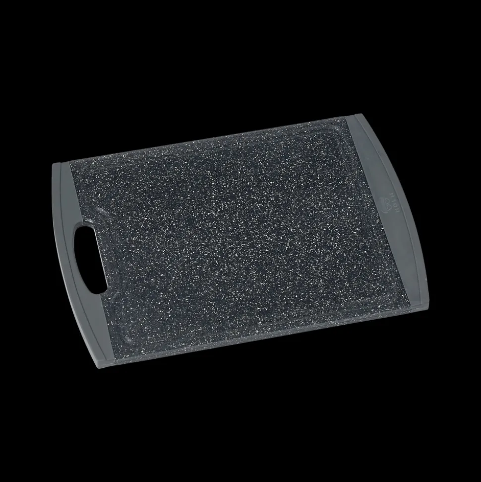 Skærebræt med kant i gråt gummi med anti-skrid-funktion. 29,2 x 20,3 x 1 cm. De skridsikre ender gør, at brættet ligger stabilt på bordet. Skærebrættet er forsynet med saftriller. Nemt at rengøre. Skærebrættet er fremstillet med en skæreflade i PP plast og en kant i TPE gummi.