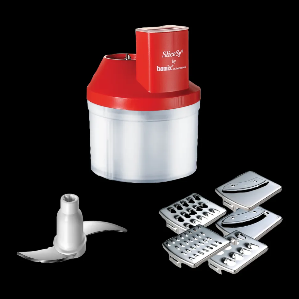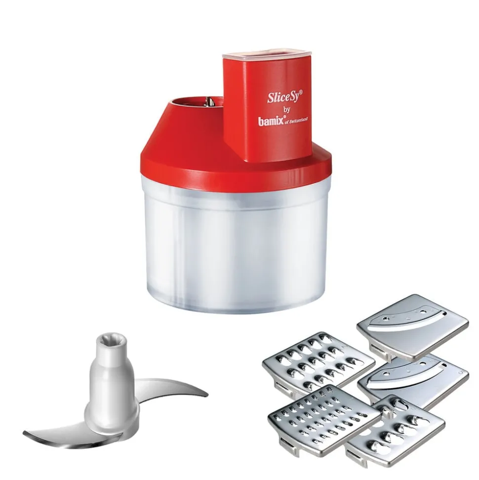 bamix®-tilbehør. SliceSy® til at hakke, rive, snitte og kværne – det hele klaret på den halve tid. Kan også bruges til at røre og blande dej. Produktet har en kapacitet på ca. 6 dl og leveres med 5 knivblade.