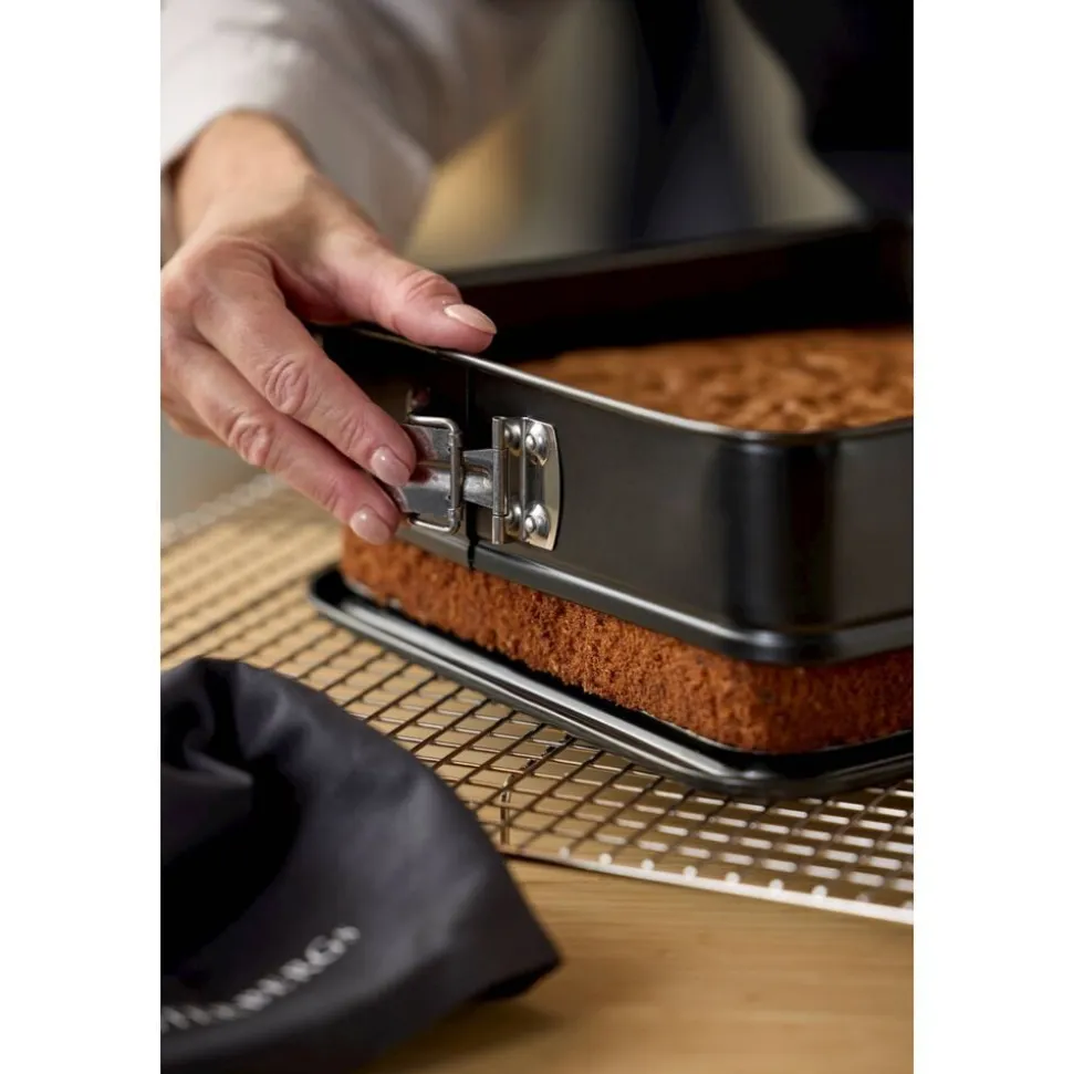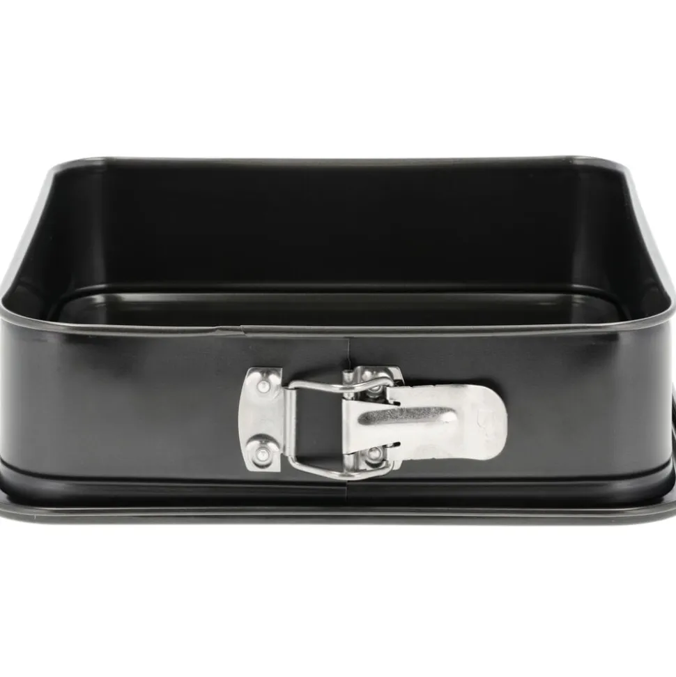Kvadratisk springform i let stål med non-stick belægning. Anvendes til alle slags bagte rørekager som fx chokoladekage, til lækre brød og tykke lagkage- og dessertbunde. Smør formen indvendigt ved bagning. Vaskes i opvaskemaskine før første brug. Den keramiske belægning er fremstillet af råvarer, der ikke indeholder PFAS.