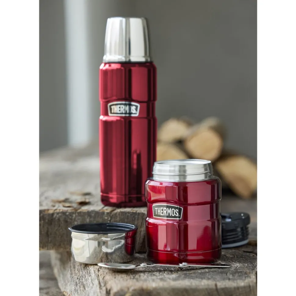 Thermos Stainless King 470 ml madtermoflaske i rustfrit stål med foldbar ske i låget. Låget kan bruges som spiseskål til fx suppe eller som kop til dine drikkevarer. Velegnet til både kolde og varme drikke, og holder indholdet varmt i op til 9 timer og koldt i op til 14 timer.